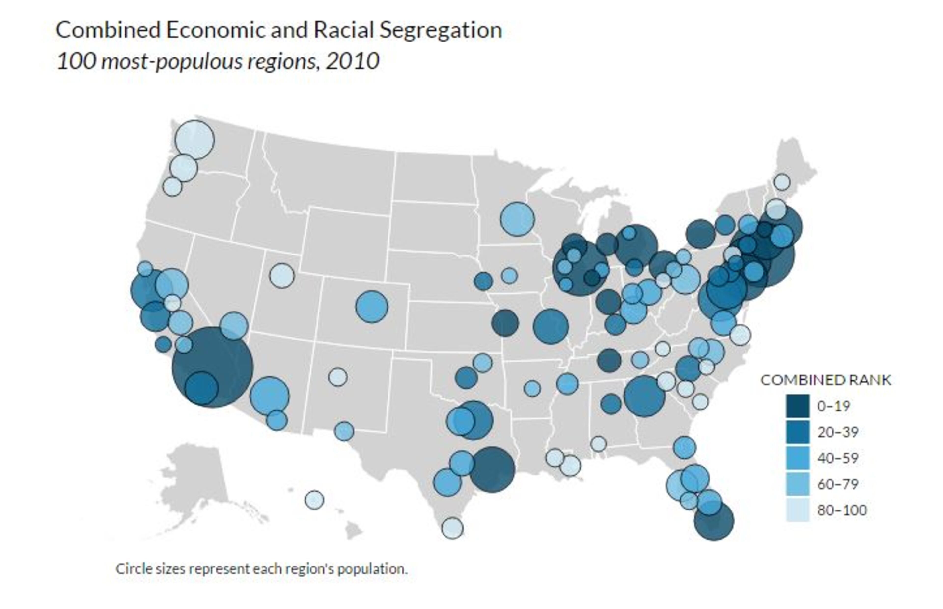 Here's a look at how the study's combined racial and economic segregation data shows up on a map. Darker circles indicate greater segregation. An interactive version of this map is on the institute's website here.