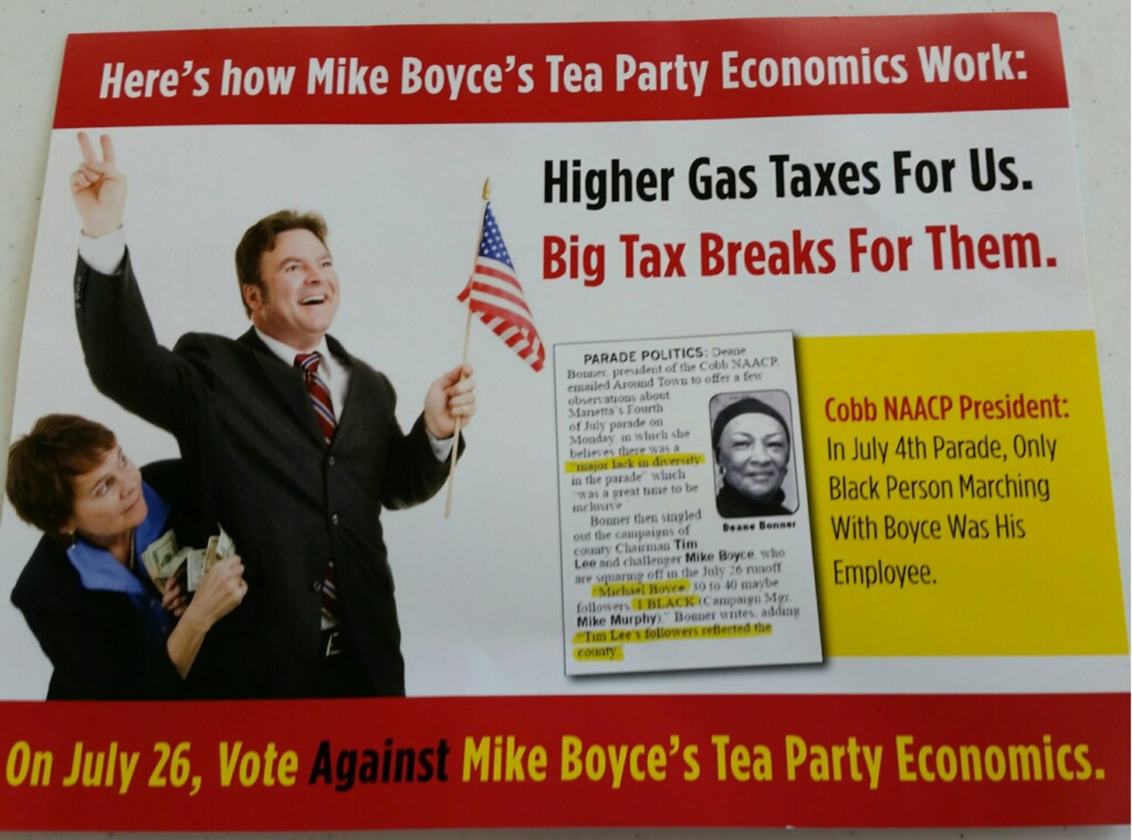 Deane Bonner, president of the Cobb branch of the NAACP, was also featured in a mailer, with a quote from her in the Marietta Daily Journal saying the only black person marching with Boyce in the county's 4th of July parade was his employee.