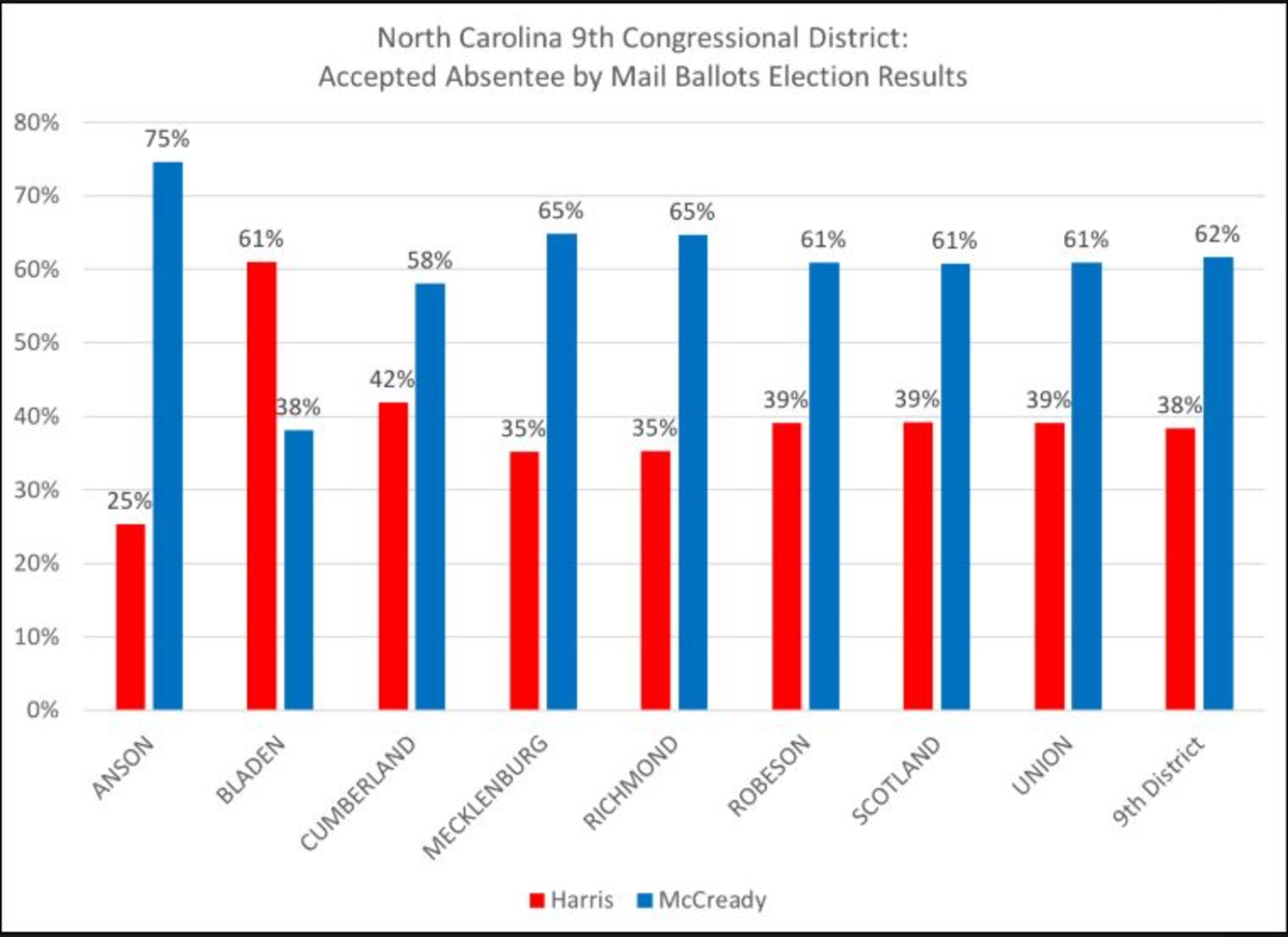 A review of absentee ballots in the nine counties which make up the 9th District done by Dr. Michael Bitzer, a political scientist at Catawba College in North Carolina, shows a striking anomaly when it comes to the tally of those ballots from Bladen County.
