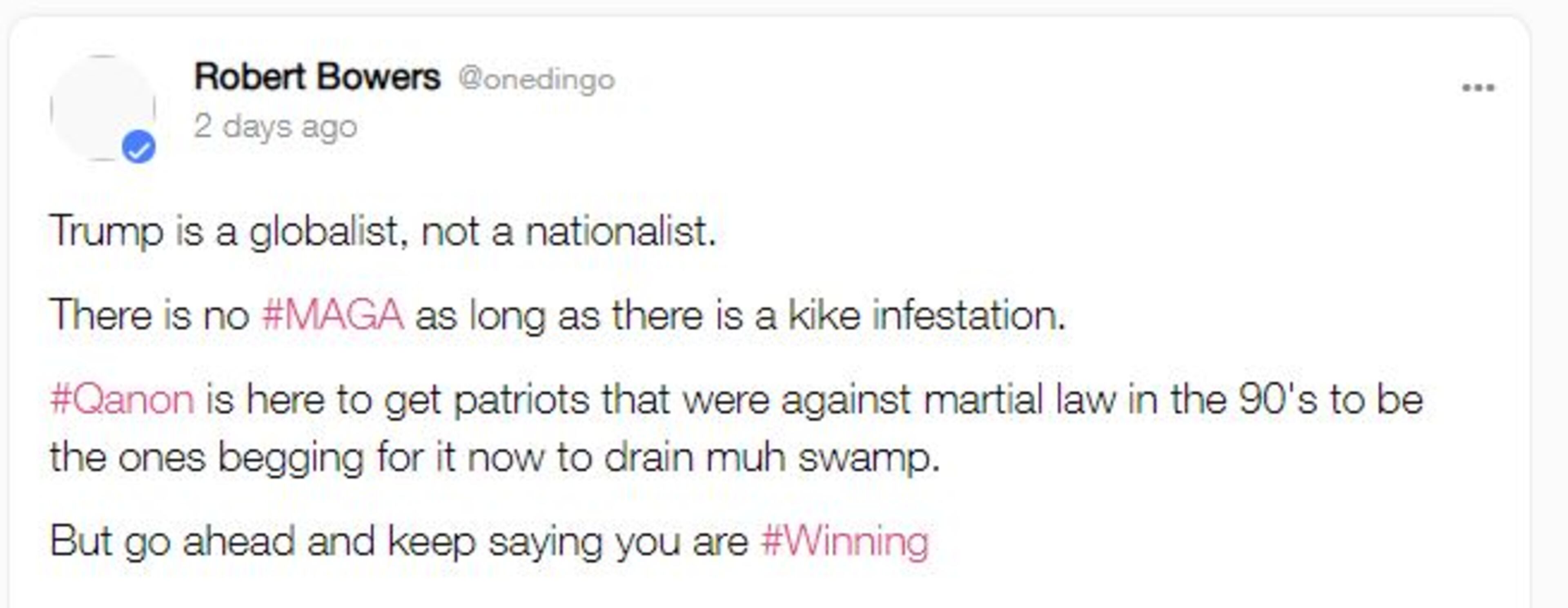 "There is no #MAGA as long as there is a kike infestation," Bowers added, using a Jewish slur.