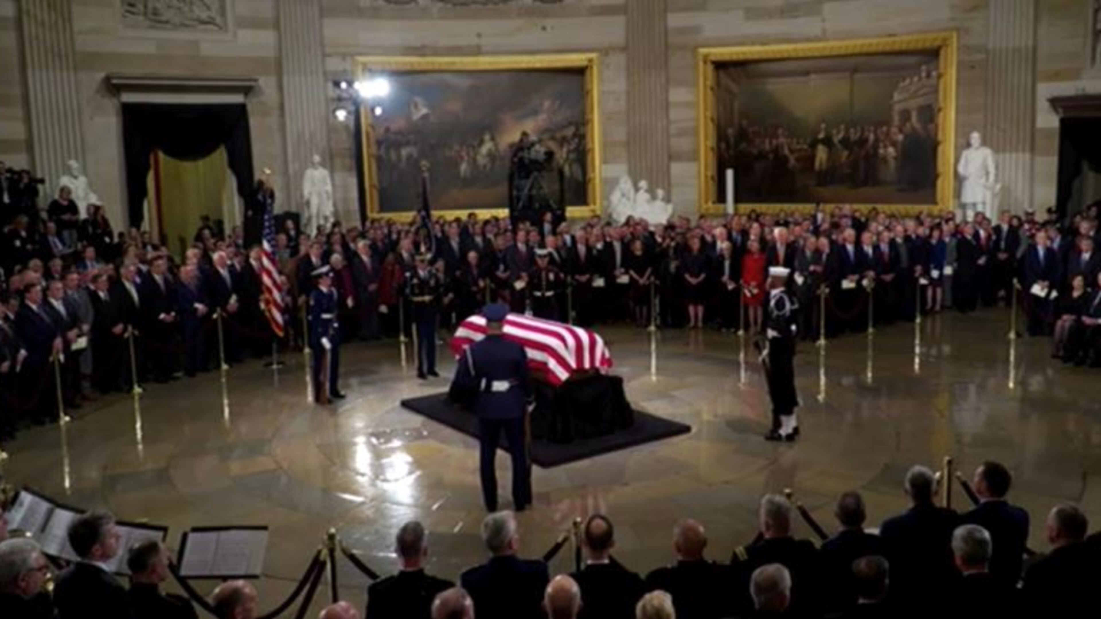 Outside in the cold, thousands of people had been lining up for hours to enter the Rotunda for a few minutes in order to get their glimpse of the flag-draped coffin; earlier, Vice President Pence said Mr. Bush had been an inspiration for the nation.