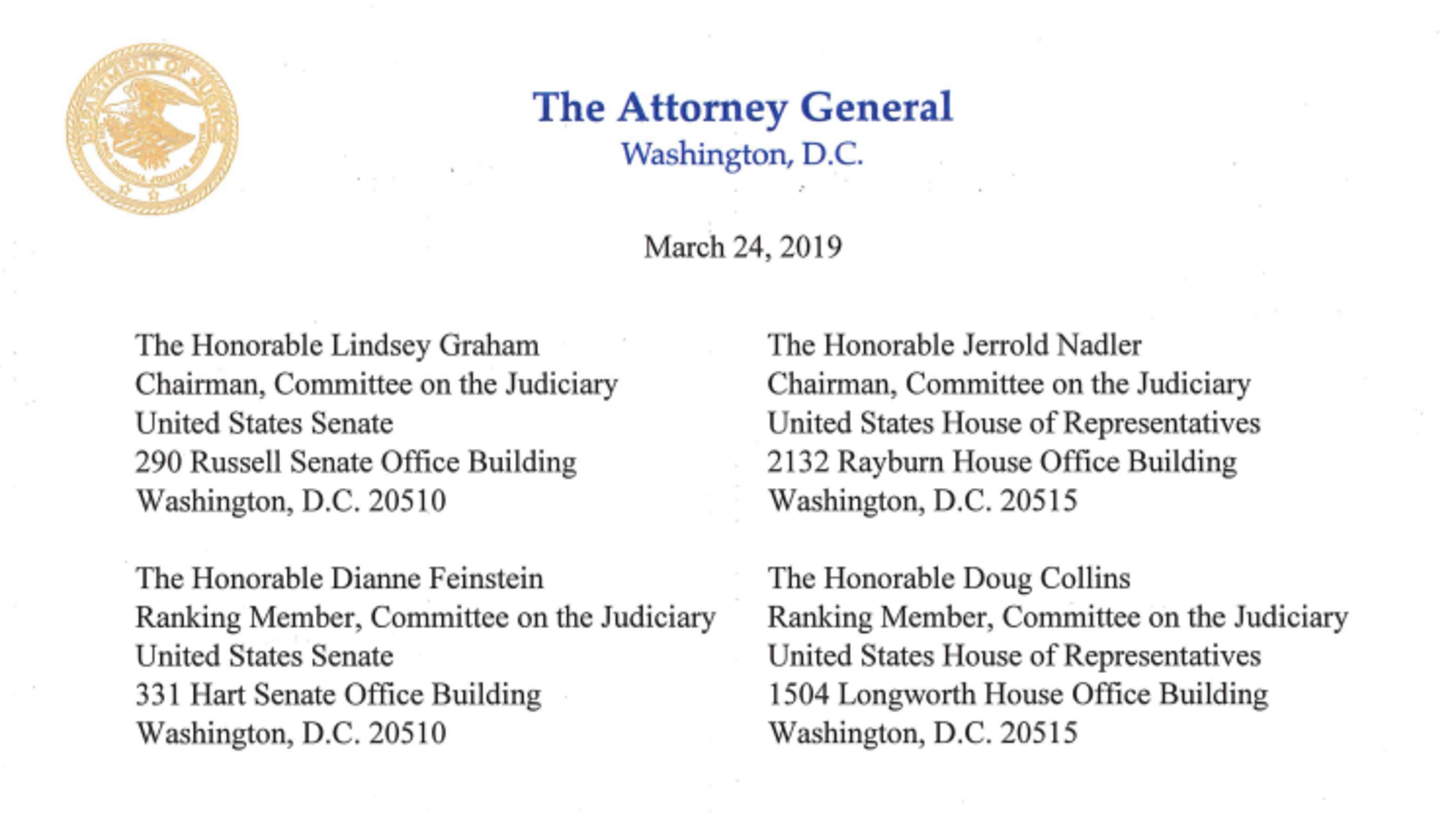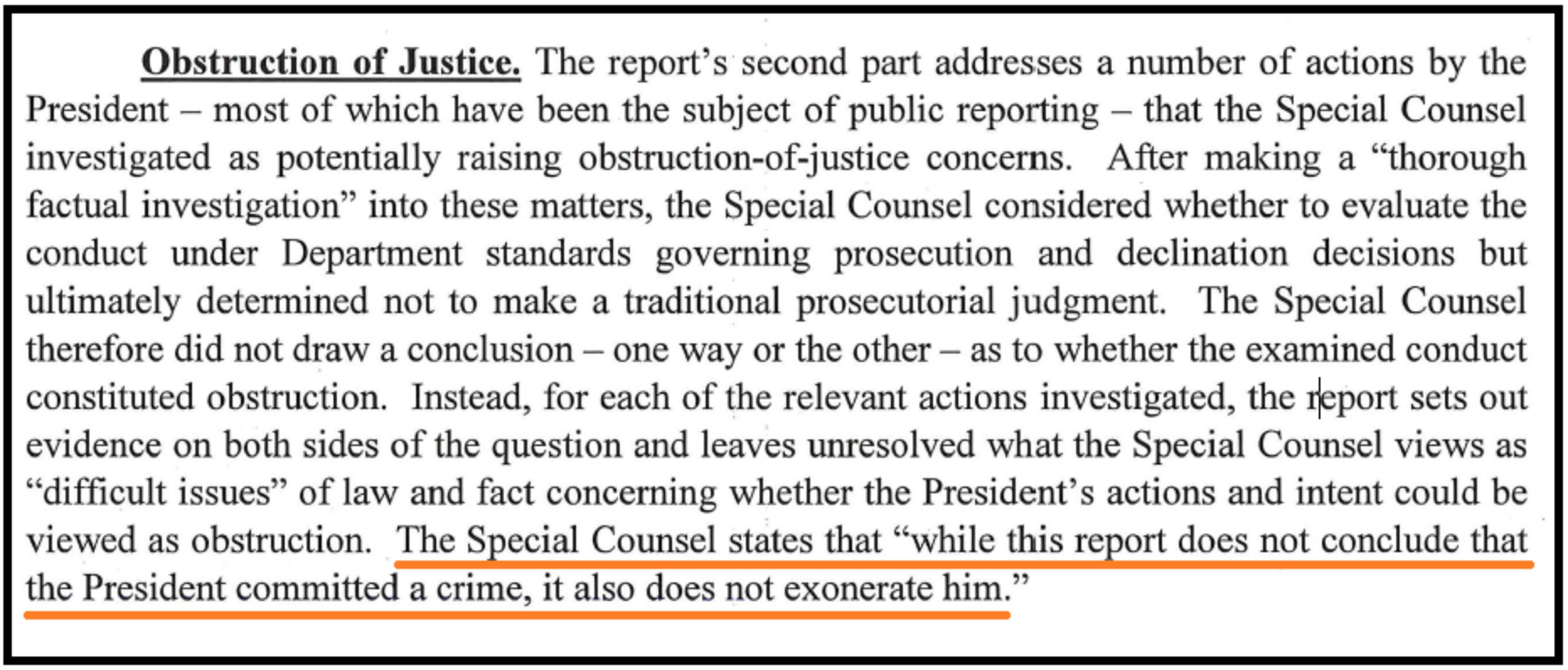 "The Special Counsel states that 'while this report does not conclude that the President committed a crime, it also does not exonerate him,'" the Attorney General wrote, in quoting the Mueller report’s section about the issue of obstruction of justice.
