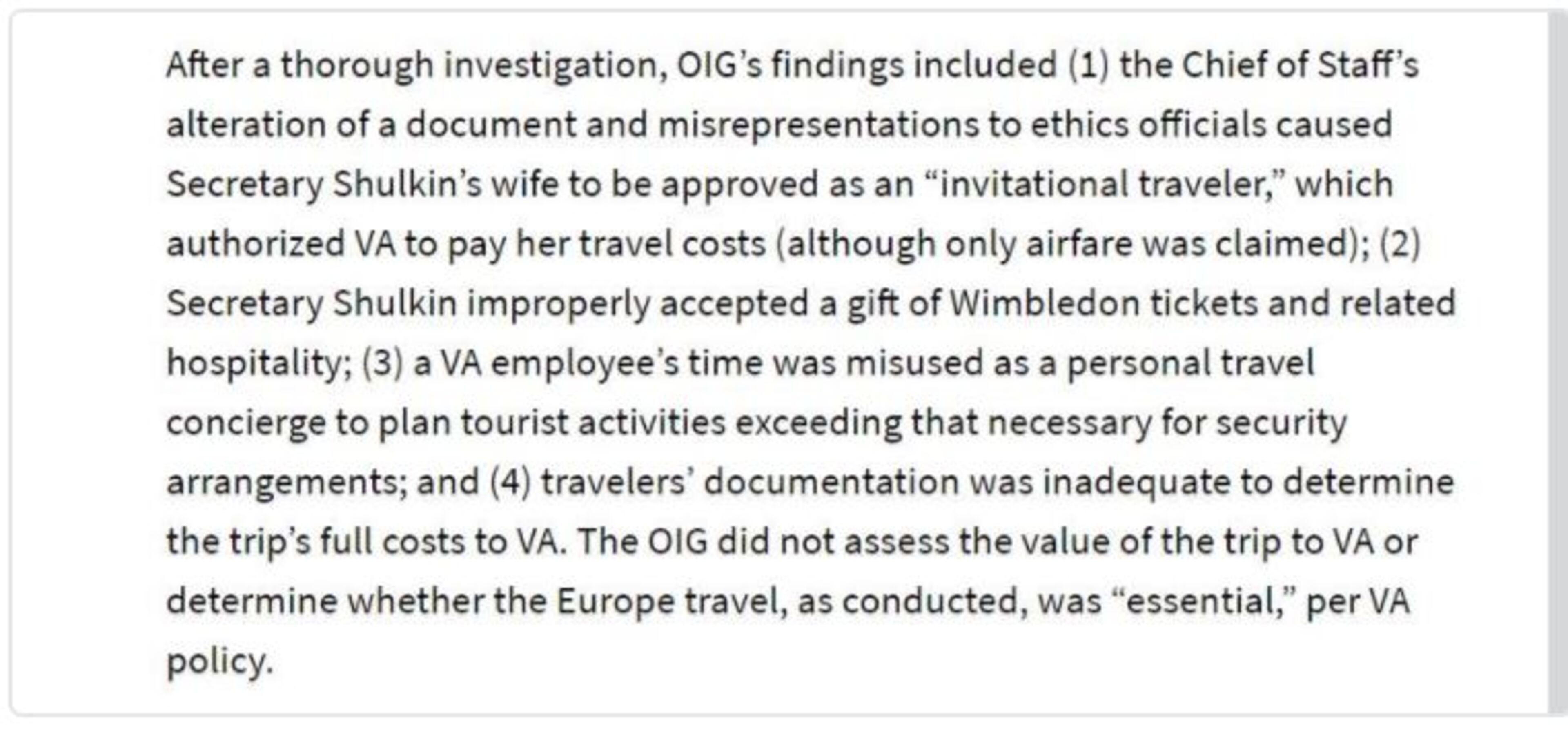 Shulkin did not accept most of the findings in this report, as his legal counsel sent a lengthy letter to the VA Inspector General, accusing the VA of running an unfair investigation, which itself was beset by misconduct.