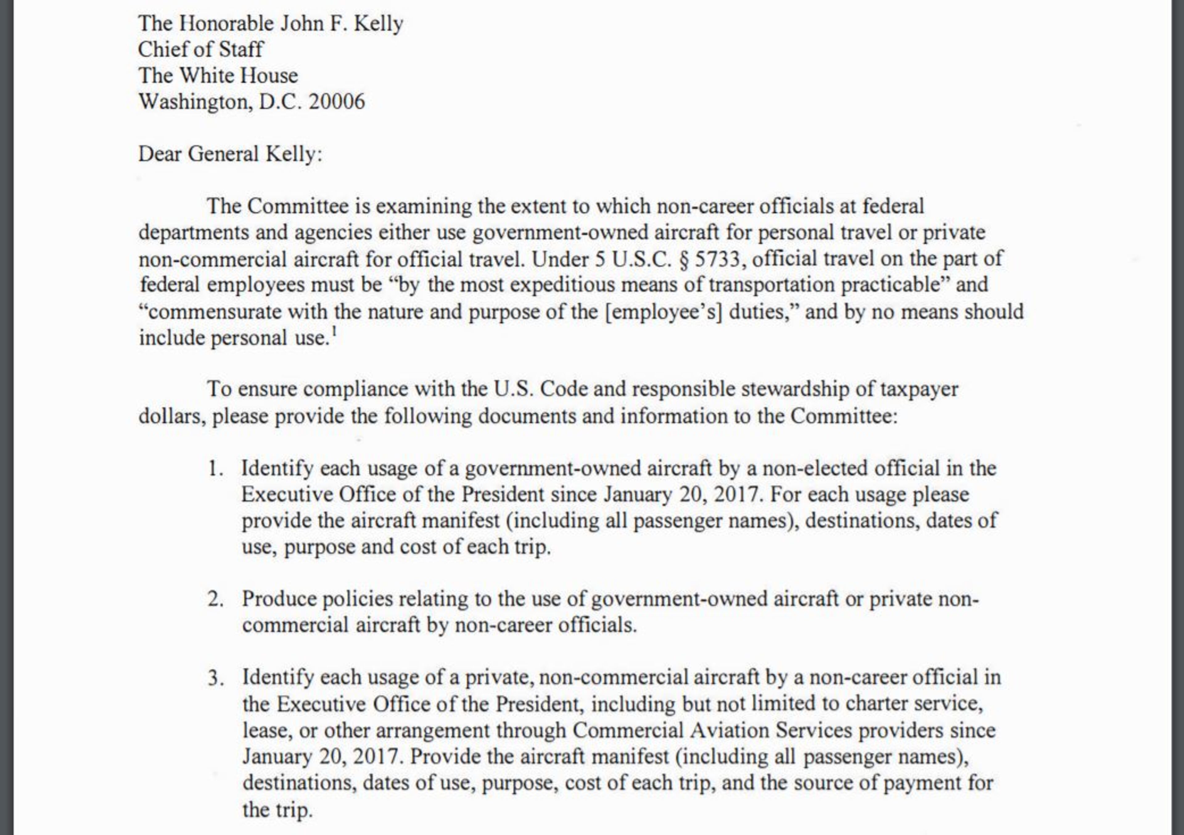 "The Committee is examining the extent to which non-career officials at federal departments and agencies either use government-owned aircraft for personal travel or private non-commercial aircraft for official travel," read a bipartisan letter sent to White House Chief of Staff.