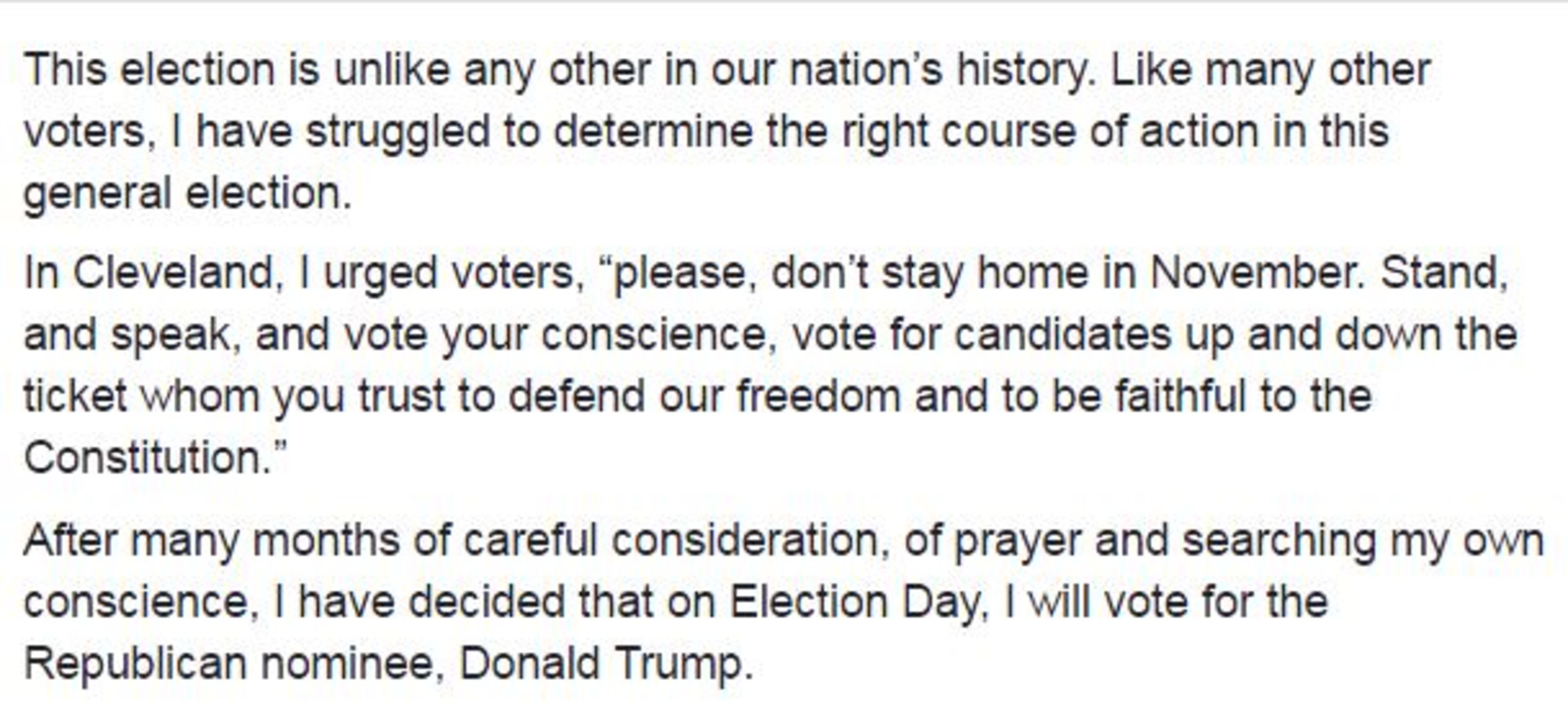 "I've made this decision for two reasons," Cruz wrote in a post on Facebook . "First, last year, I promised to support the Republican nominee. And I intend to keep my word."