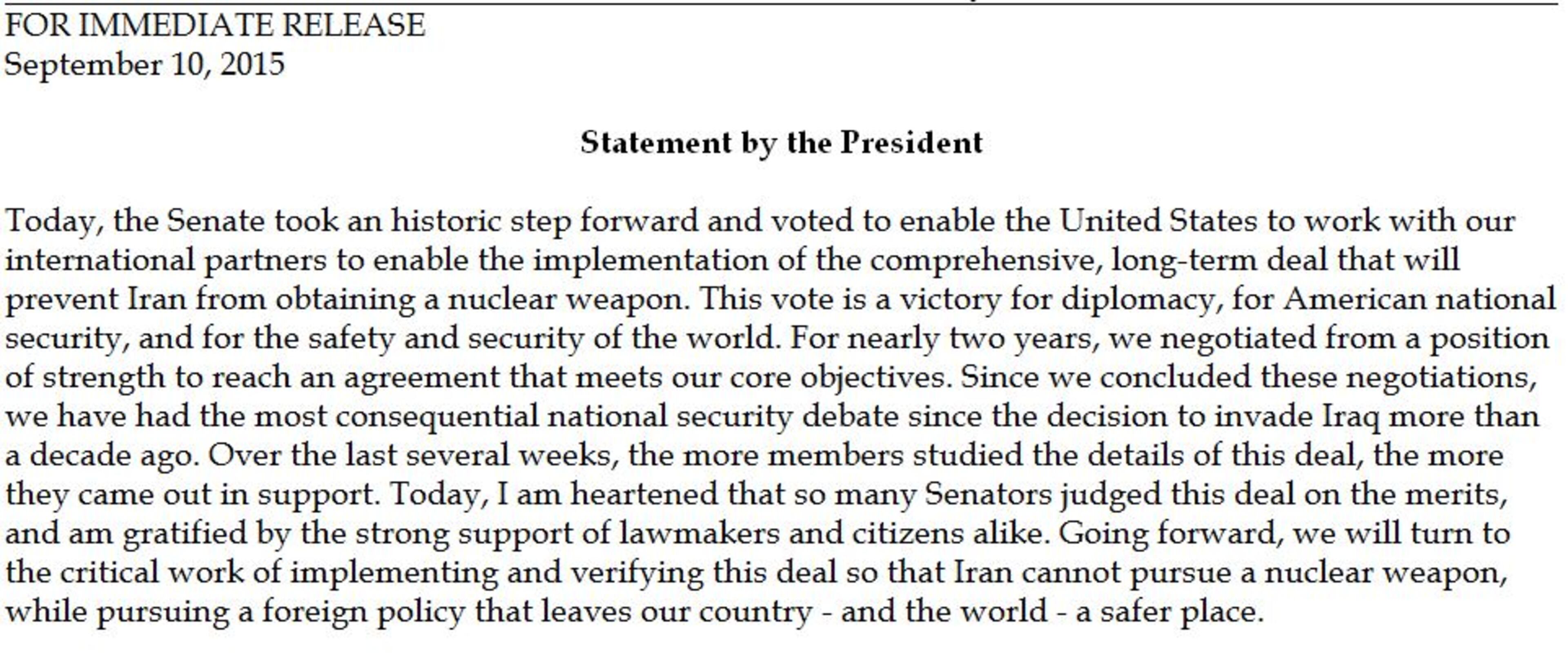 "This vote is a victory for diplomacy, for American national security, and for the safety and security of the world," President Obama said in a written statement issued by the White House.