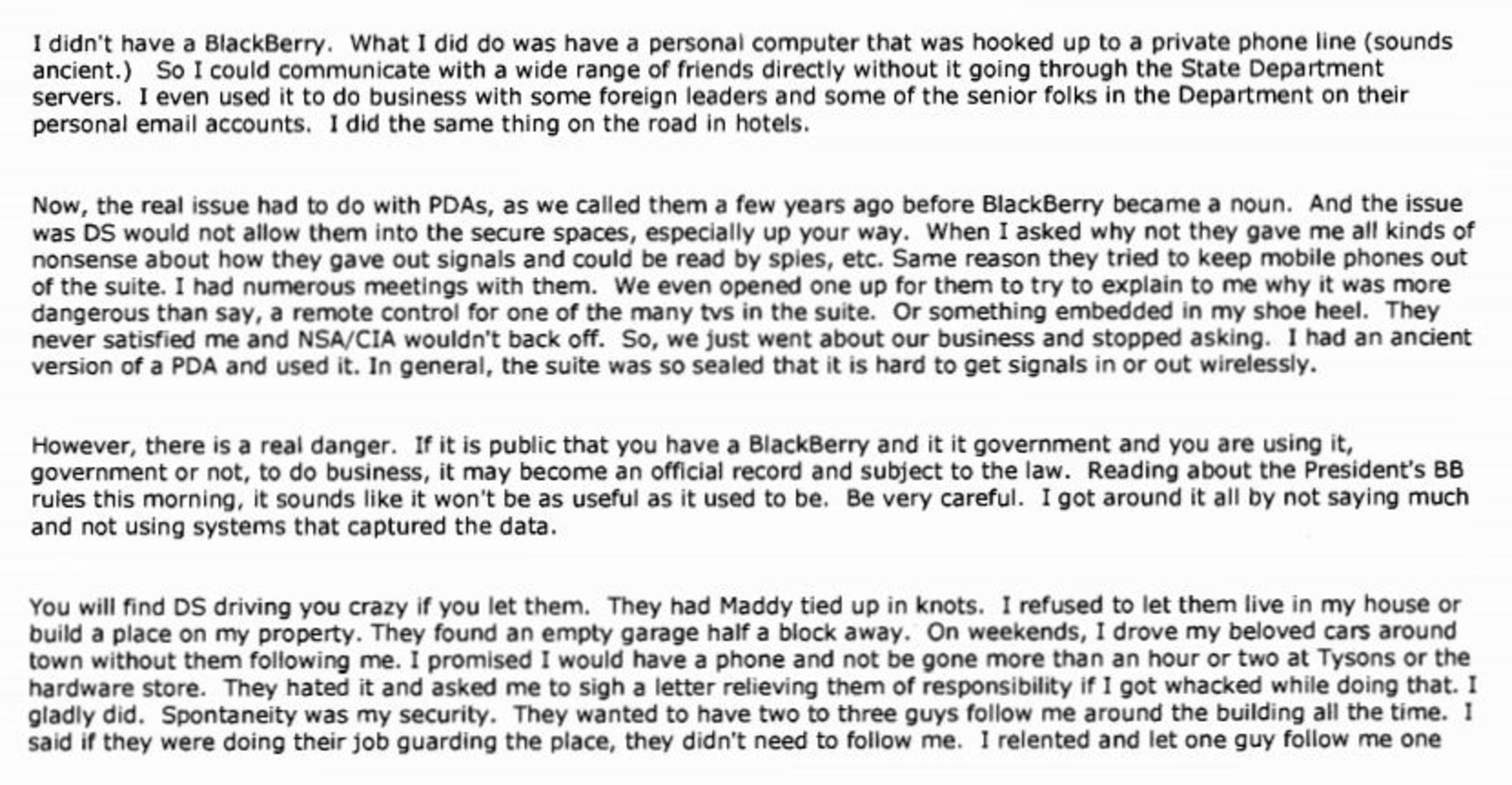 Powell's response described how he went around State Department security, as he warned Clinton that any business conducted via email might make it into official records.