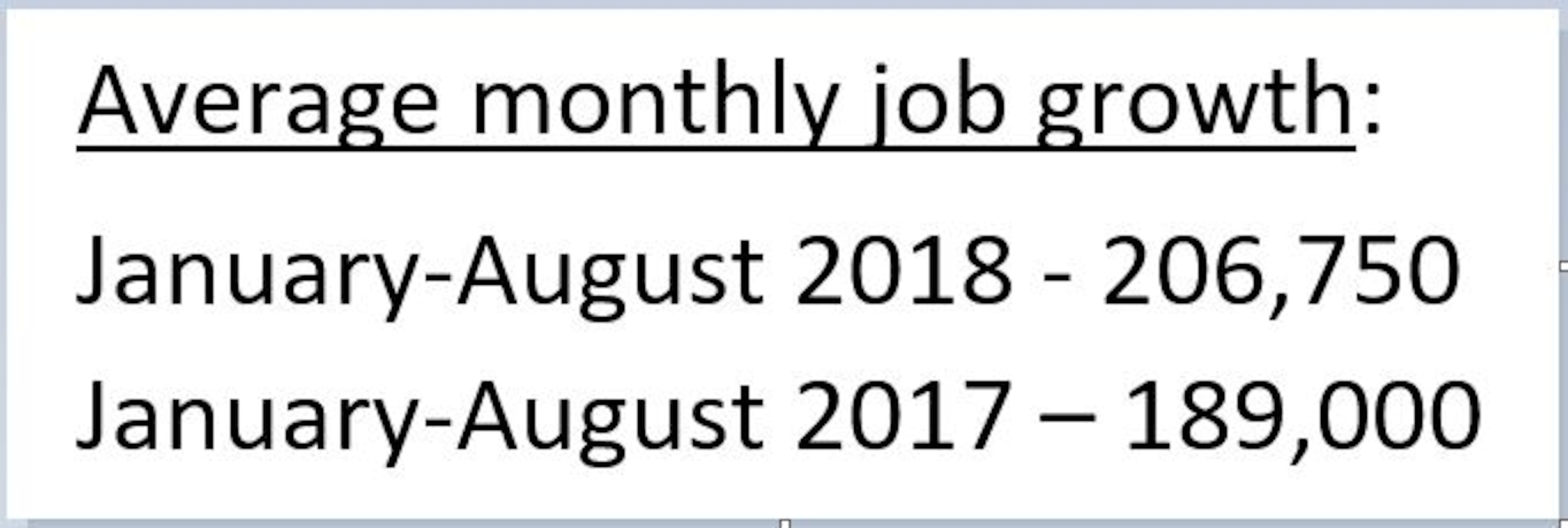 Even with revisions reducing the number of jobs created in both June and July, the economy is producing new jobs at a higher pace than the same eight month period a year ago, averaging almost 207,000 jobs a month in 2018 compared to 189,000 a month in 2017.