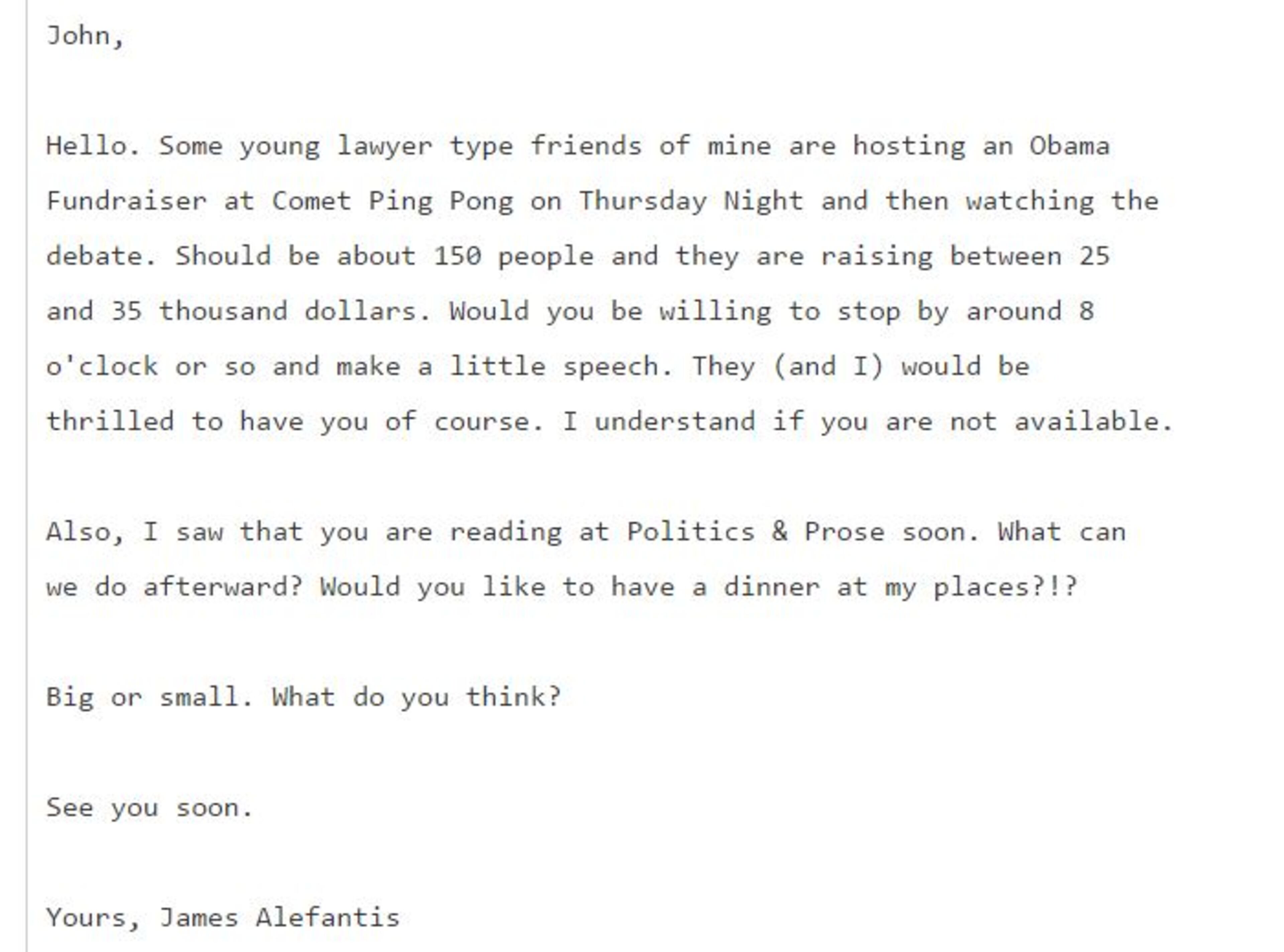 Go to the hacked emails to and from John Podesta, and you can find one from September of 2008, where Podesta is invited to the Comet Ping Pong restaurant to watch an Obama-McCain debate: