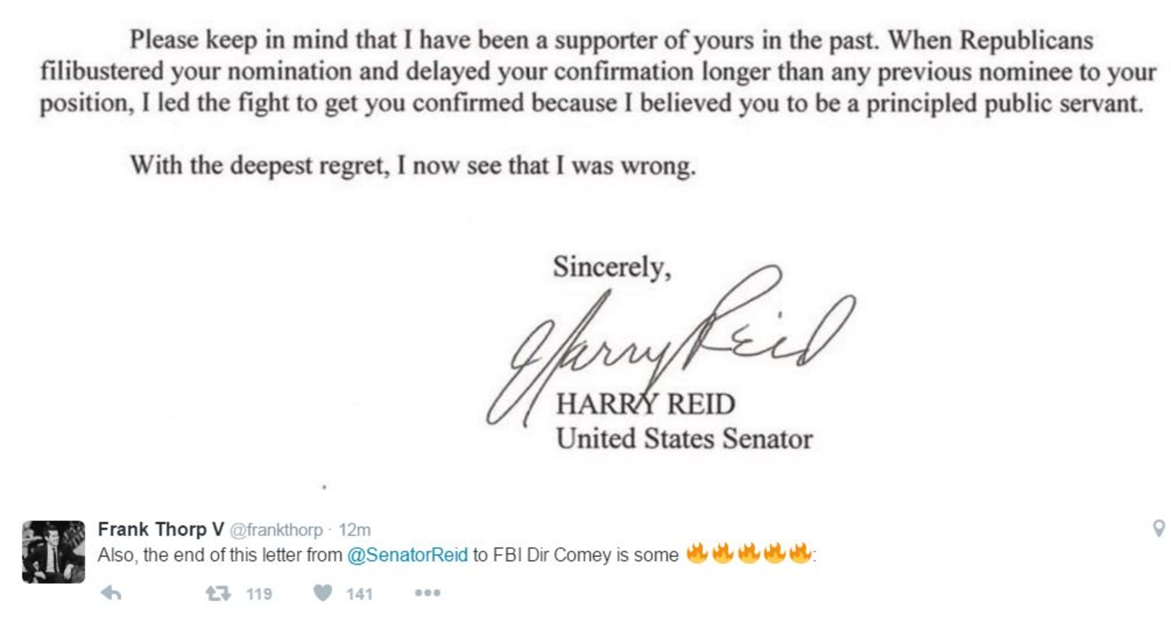Reid also used that letter to demand an update from the FBI on any links between Donald Trump and the Russian government.