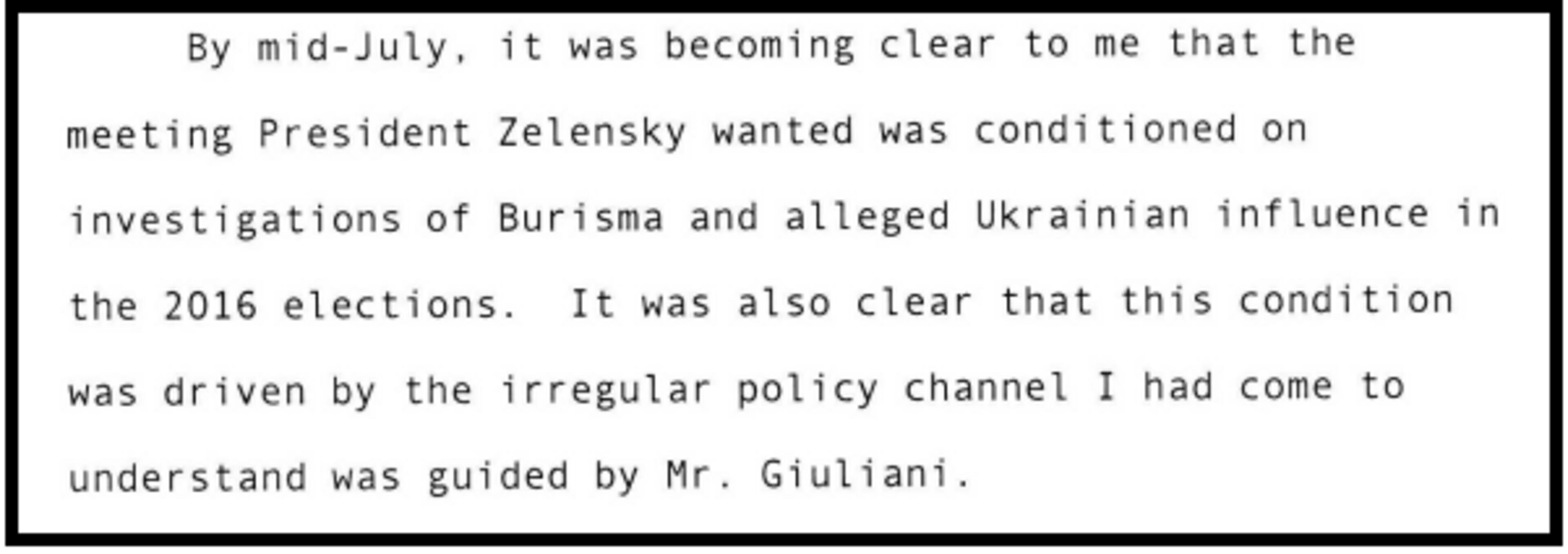 Several months after Yovanovitch had been ousted, Taylor described how the work of Giuliani had seemingly led to a situation where U.S. military aid for Ukraine was being withheld - in an effort to gain a quid pro quo - where the government of Ukraine would launch investigations sought by President Trump.