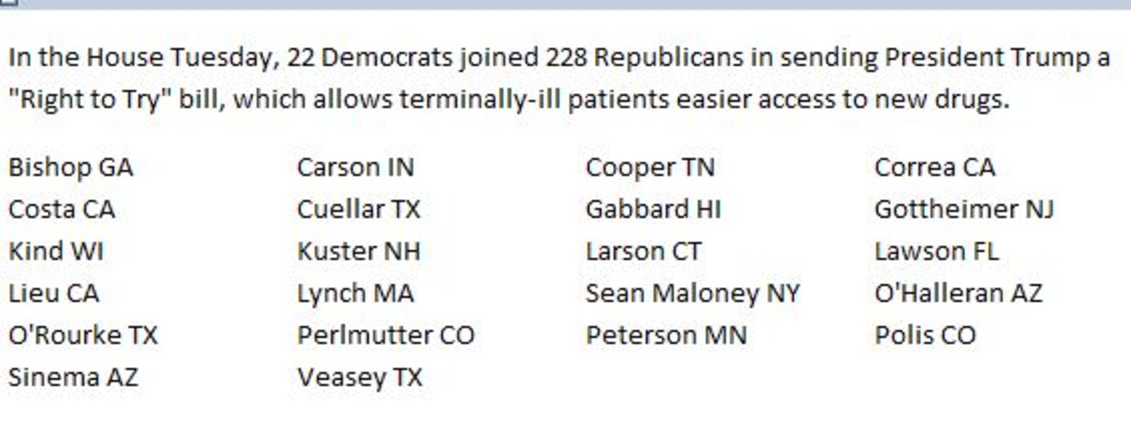 The "Right to Try" vote came just before the House approved another bill from the Senate, which eases some financial regulations enacted under the Dodd-Frank law, as 33 Democrats joined with Republicans to ease restrictions on smaller banks.