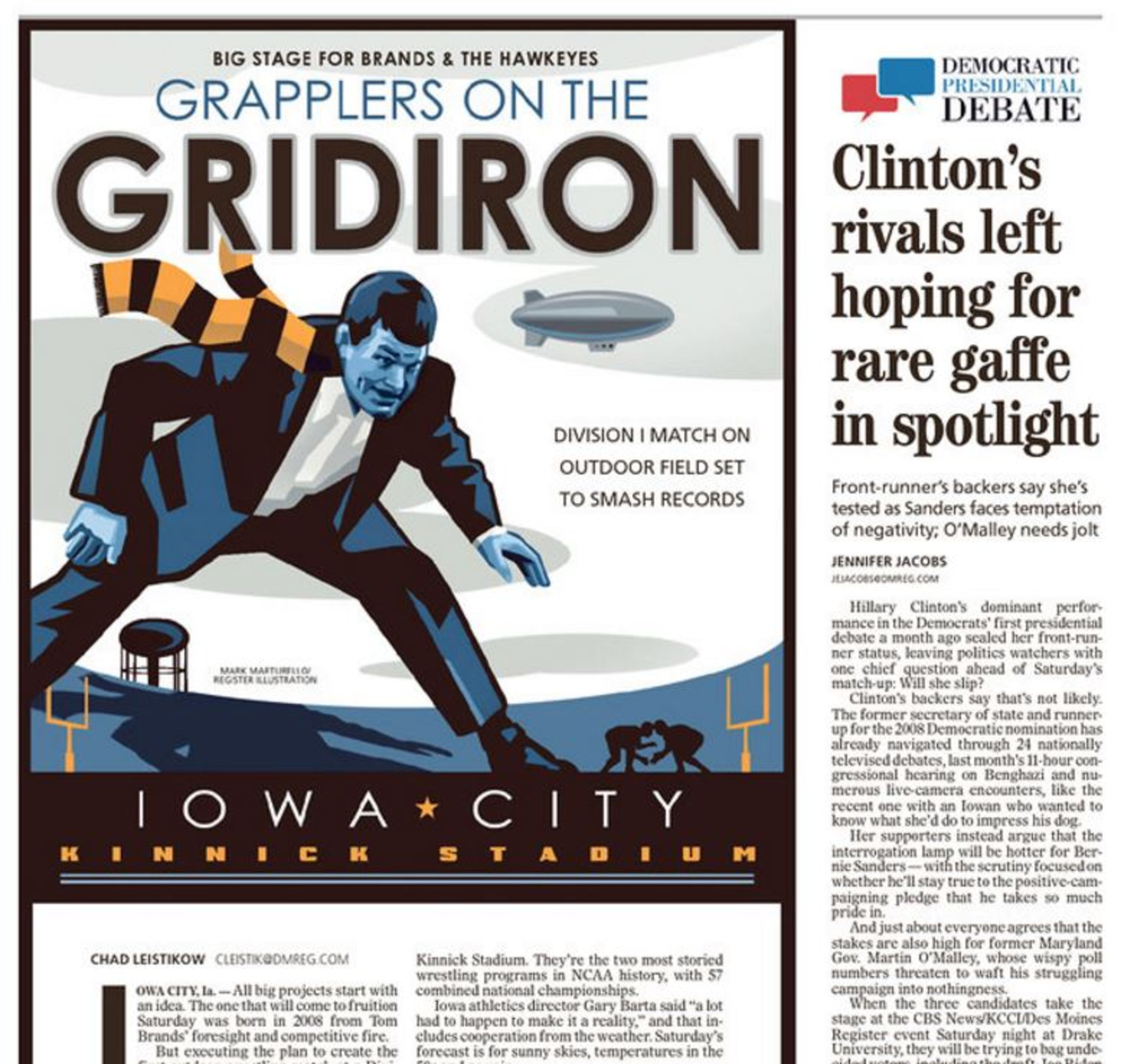 Here is Friday's front page in the Des Moines Register newspaper - getting more ink that the Democratic debate is how Iowa wrestling will have a big outdoor match.