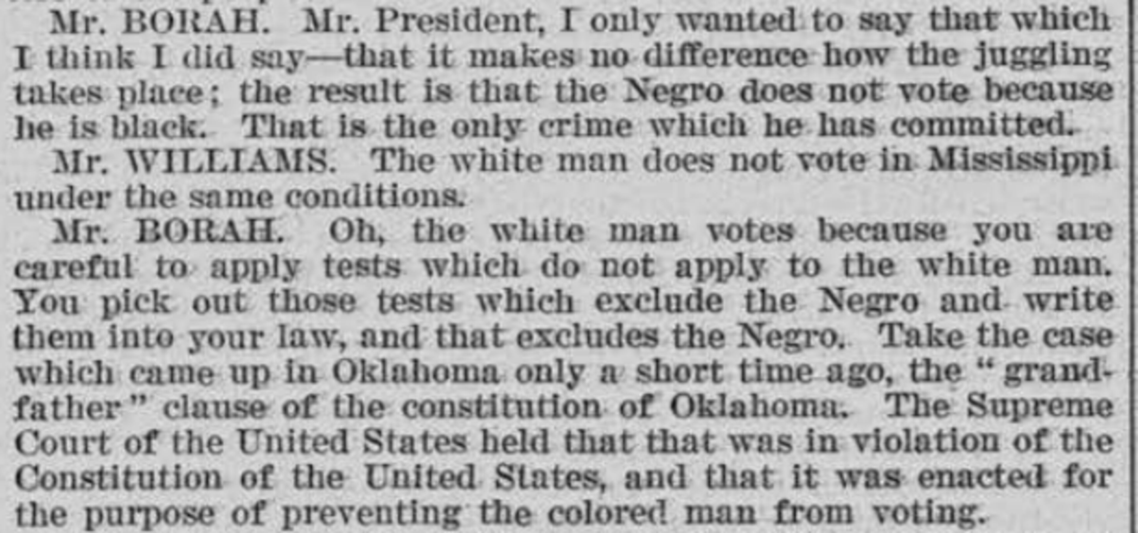 “Oh, the white man votes because you are careful to apply tests which do not apply to the white man," Senator William Borah, a Republican of Idaho, said to Senators from the South. "You pick out those tests which exclude the Negro and write them into your law, and that excludes the Negro."