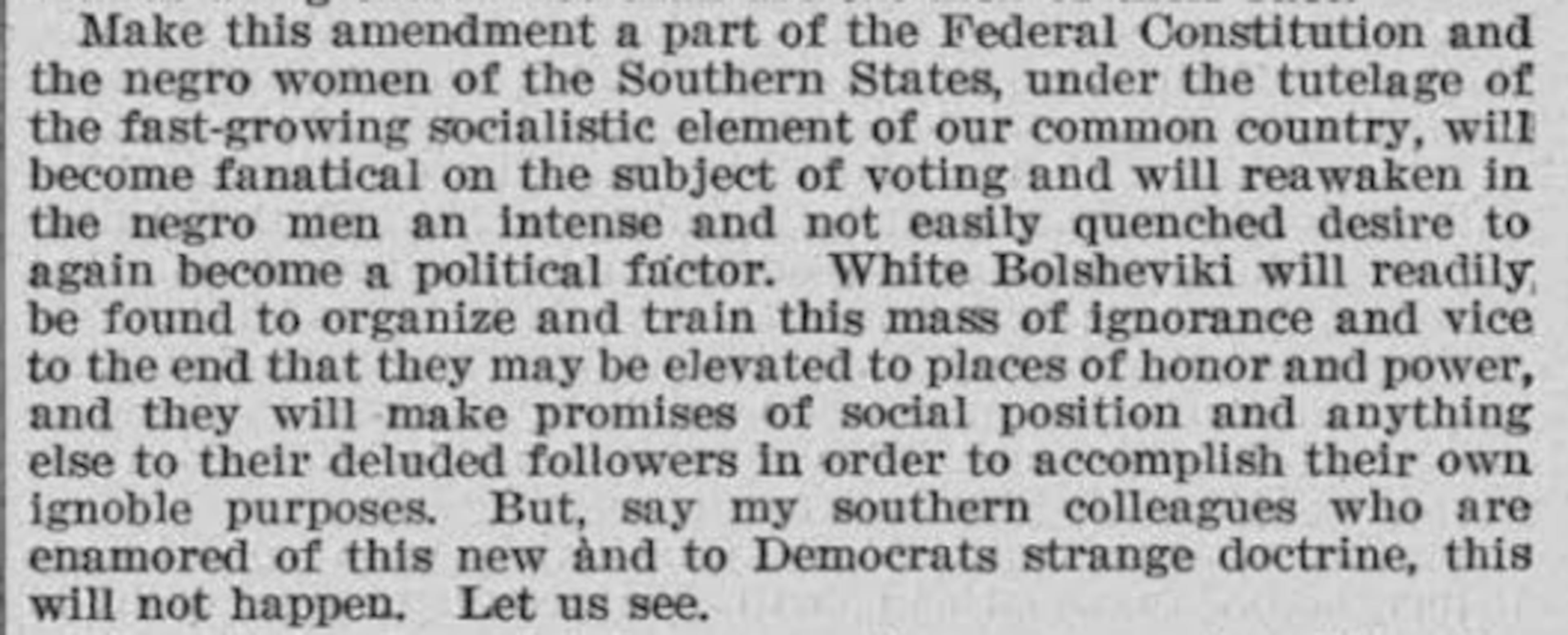 "Make this amendment a part of the Federal Constitution and the negro women of the Southern States, under the tutelage of the fast-growing socialistic element of our common country, will become fanatical on the subject of voting and will reawaken in the negro men an intense and not easily quenched desire to again become a political factor," said Clark, who led opposition to the constitutional change.