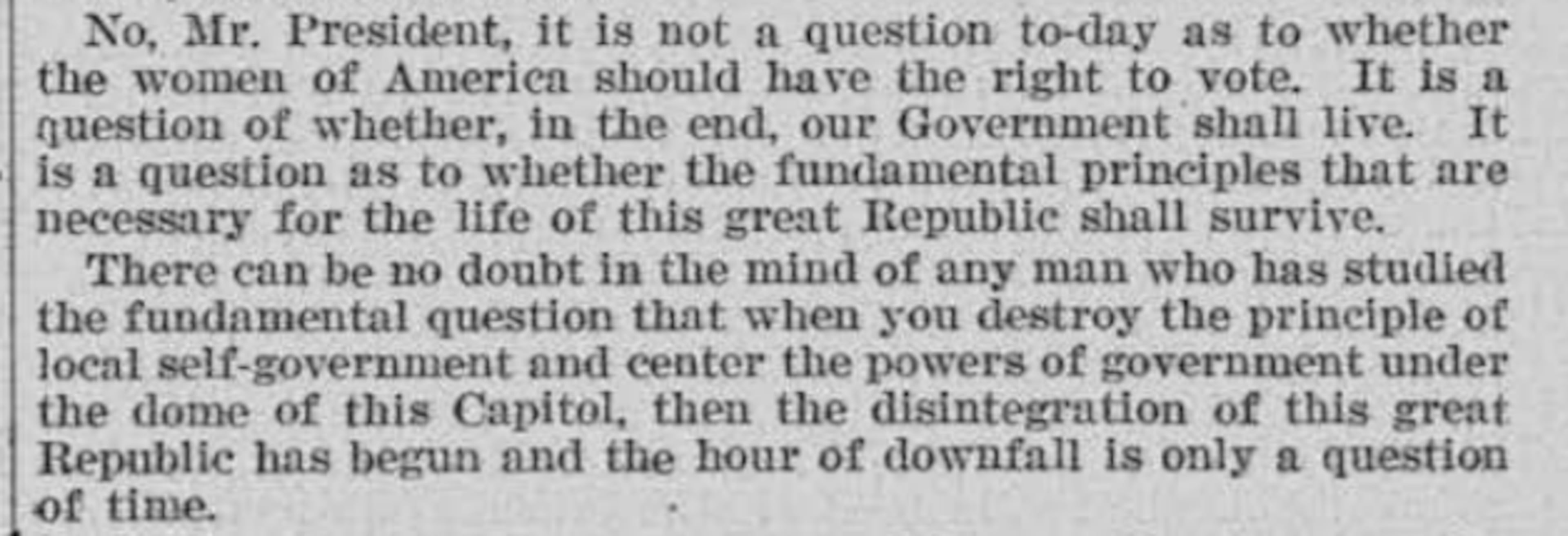 "Mr. President, it is not a question today as to whether the women of American should have the right to vote," said Sen. Oscar Underwood, a Democrat from Alabama. “It is a question of whether, in the end, our Government shall live.”
