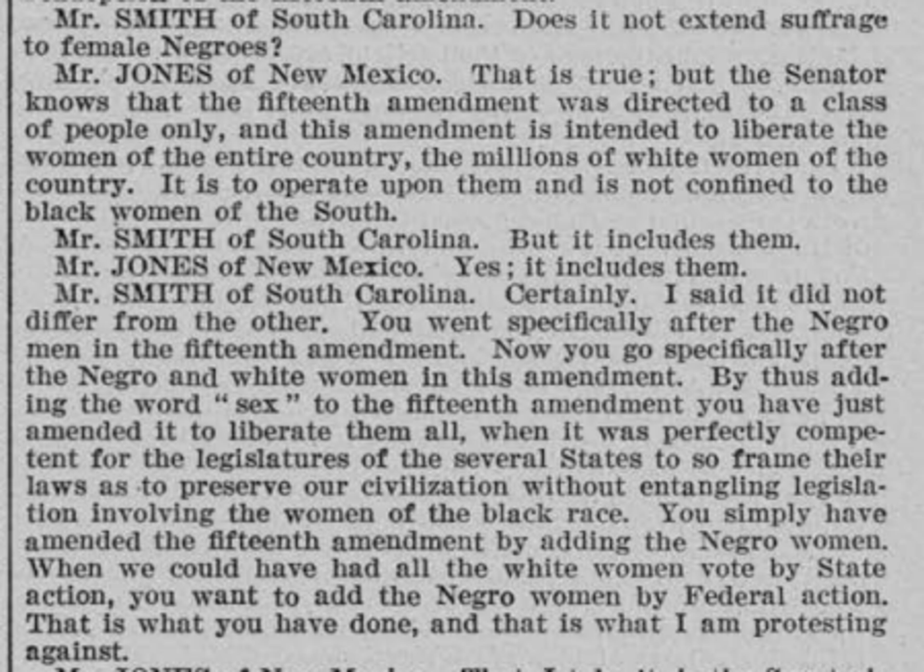 “You went specifically after the Negro men in the fifteenth amendment,” Smith said in Senate debate. “Now you go specifically after the Negro and white women in this amendment.”
