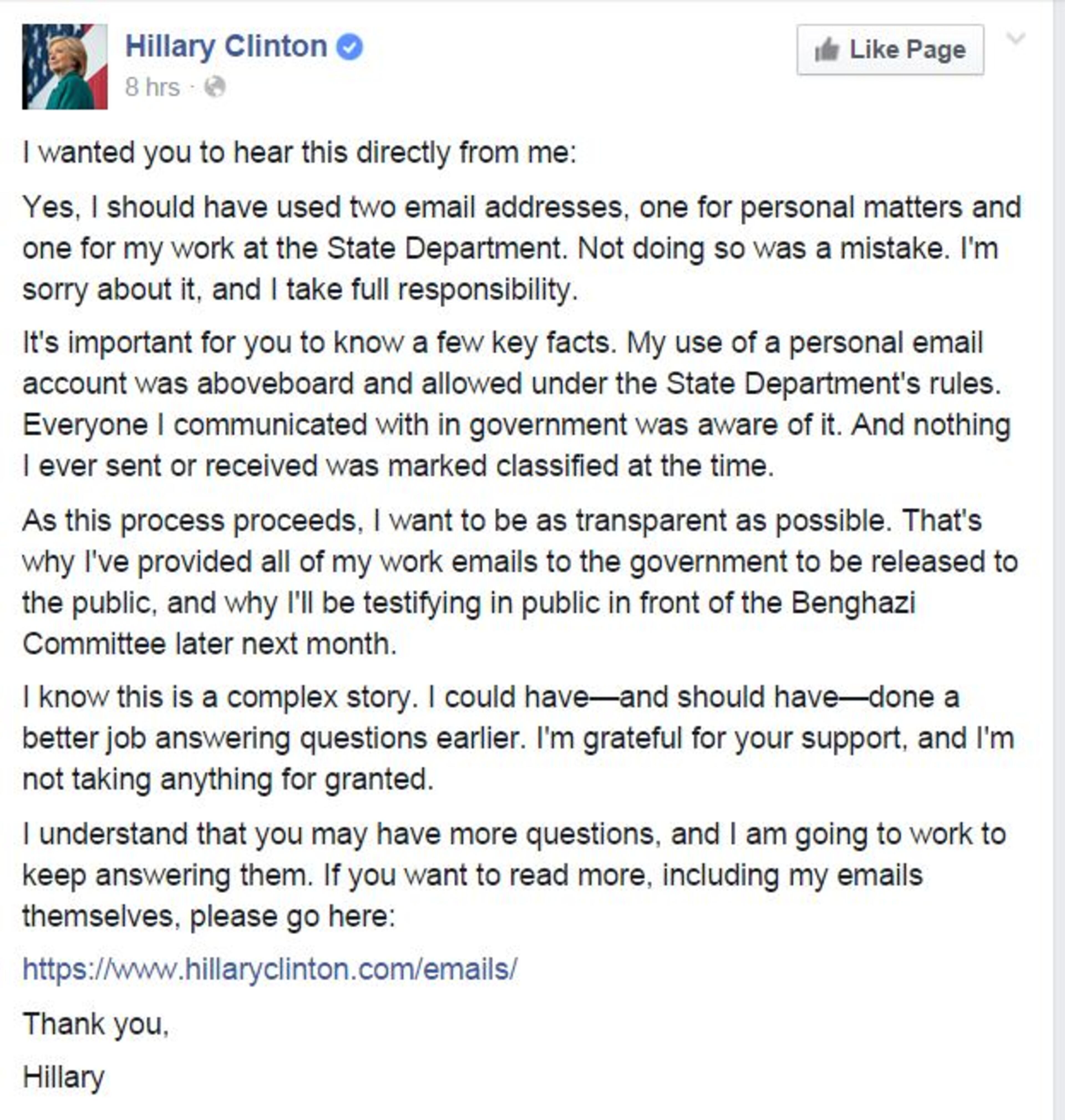 She posted this further explanation on her Facebook page late on Tuesday night: