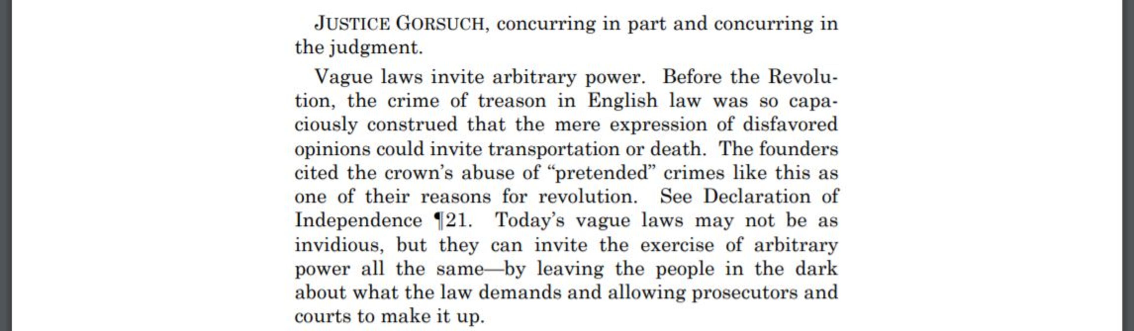 "Vague laws invite arbitrary power," Gorsuch wrote in his own concurring opinion. "The law before us today is such a law."