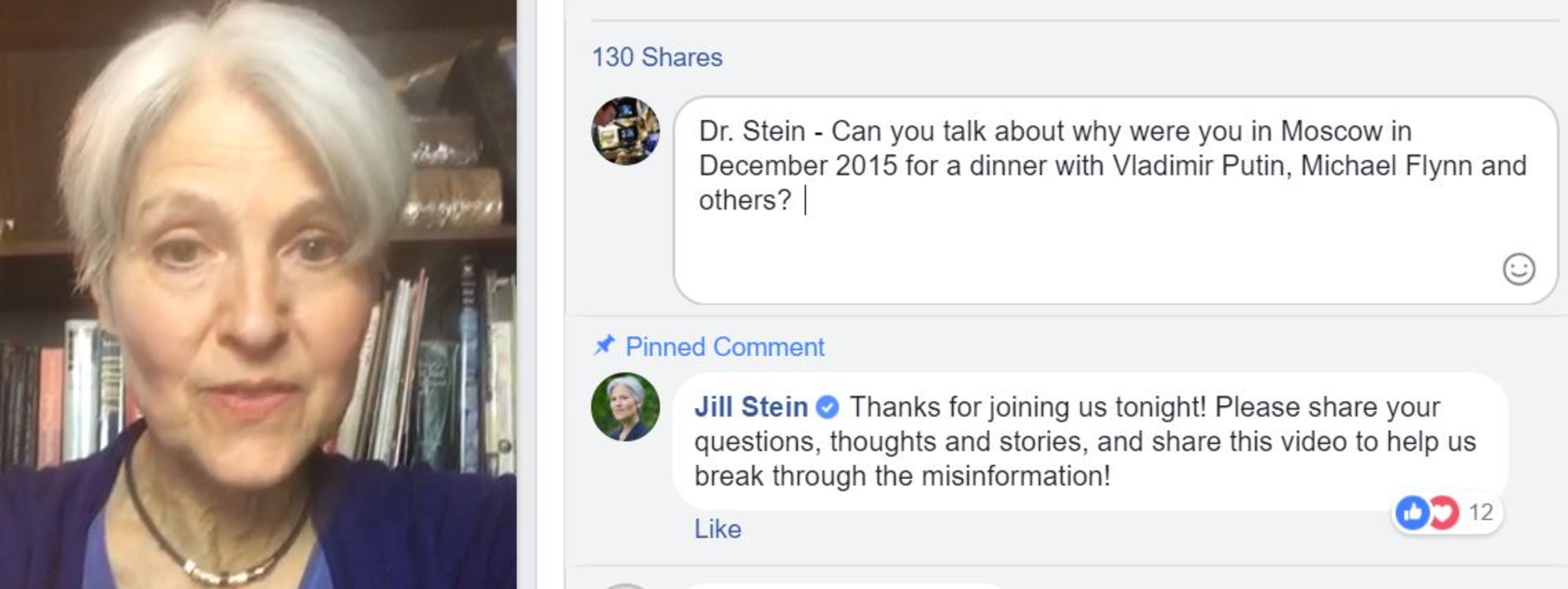 In a Facebook live video presentation for supporters on Wednesday evening, Stein said it was 'outrageous' to say she played any role in Russia's 2016 efforts to meddle in the U.S. elections, though she did address one of the more curious questions regarding that investigation, as to why she was in Moscow in December 2015 for a dinner - which featured Russian leader Vladimir Putin - also sitting at the same table with future Trump National Security Adviser Michael Flynn.