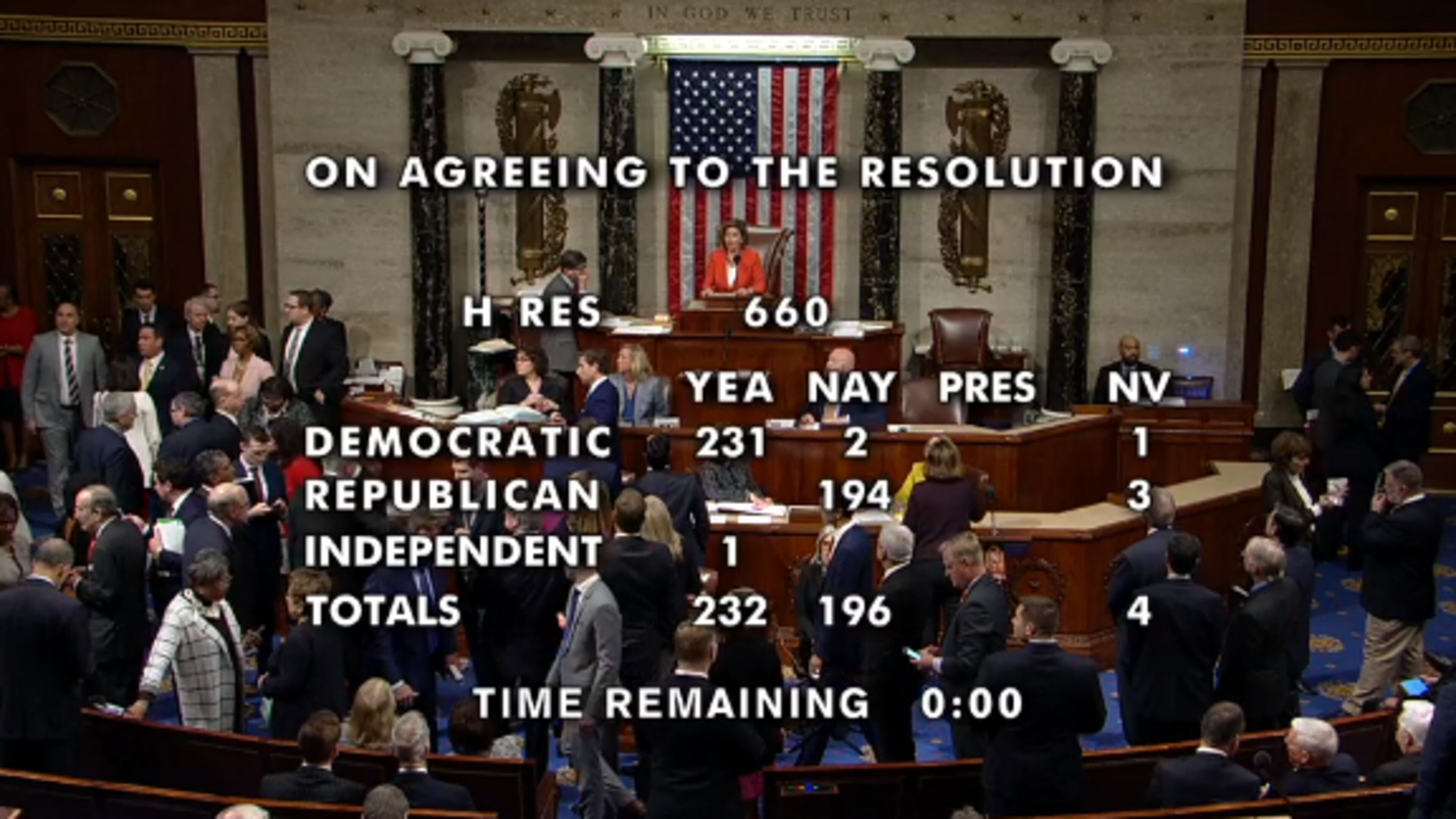 The House vote was 232 to 196. Two Democrats broke ranks to vote against the rules plan - Rep. Colin Peterson (D-MN) and Rep. Jeff Van Drew (D-NJ).