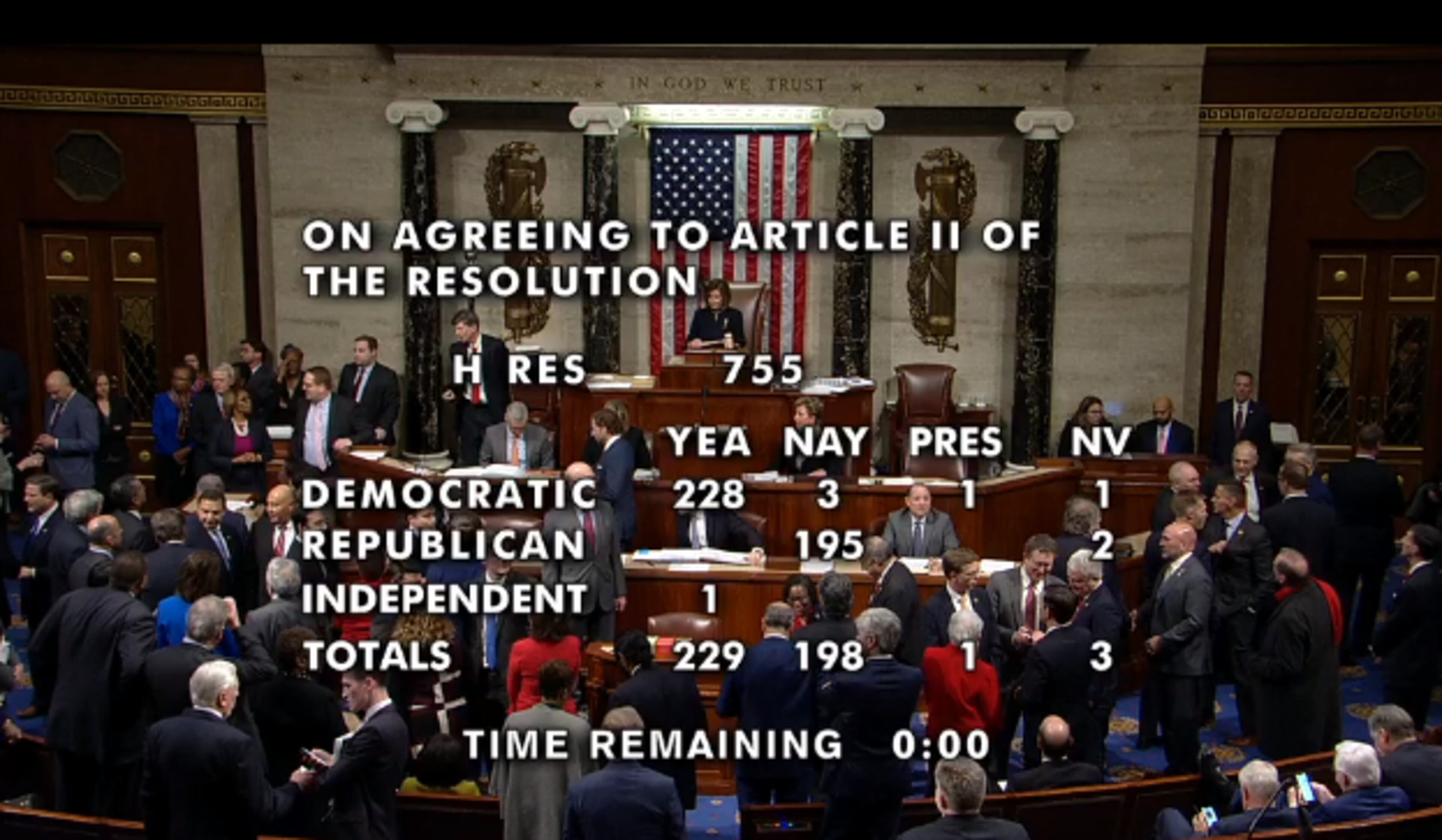 The vote on the abuse of power charge was 230 to 197 with two Democrats joining with all Republicans against the charge. Rep. Tulsi Gabbard (D-HI) voted “Present.”
