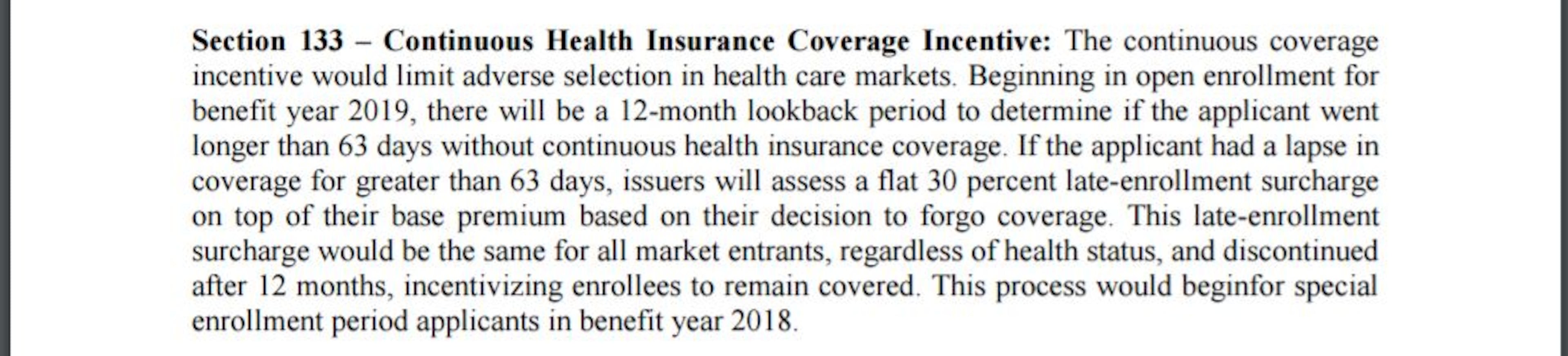 While the individual and employer mandates are effectively repealed by this legislation, there will be one provision that seems likely to draw opposition, as it would levy a 30 percent surcharge on premiums, if you have gone more than two months without health insurance coverage, but try to go back in to get coverage.