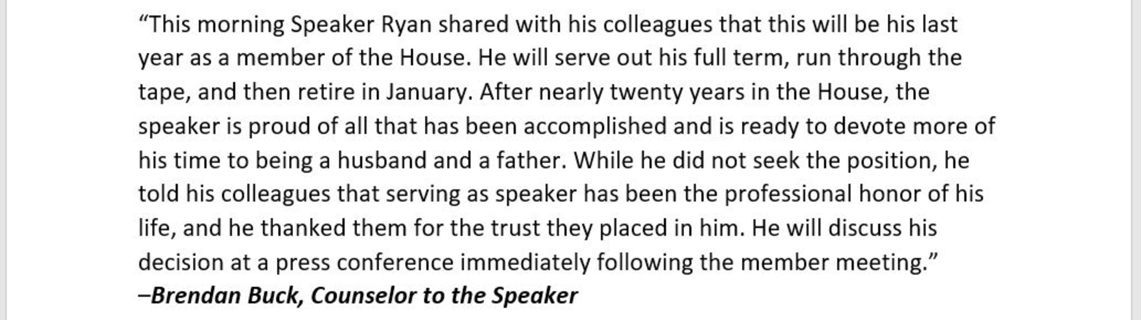 Several times in his remarks, the Speaker talked about his kids growing up, and the need for him to be at home back in Wisconsin - before his children go off to college.