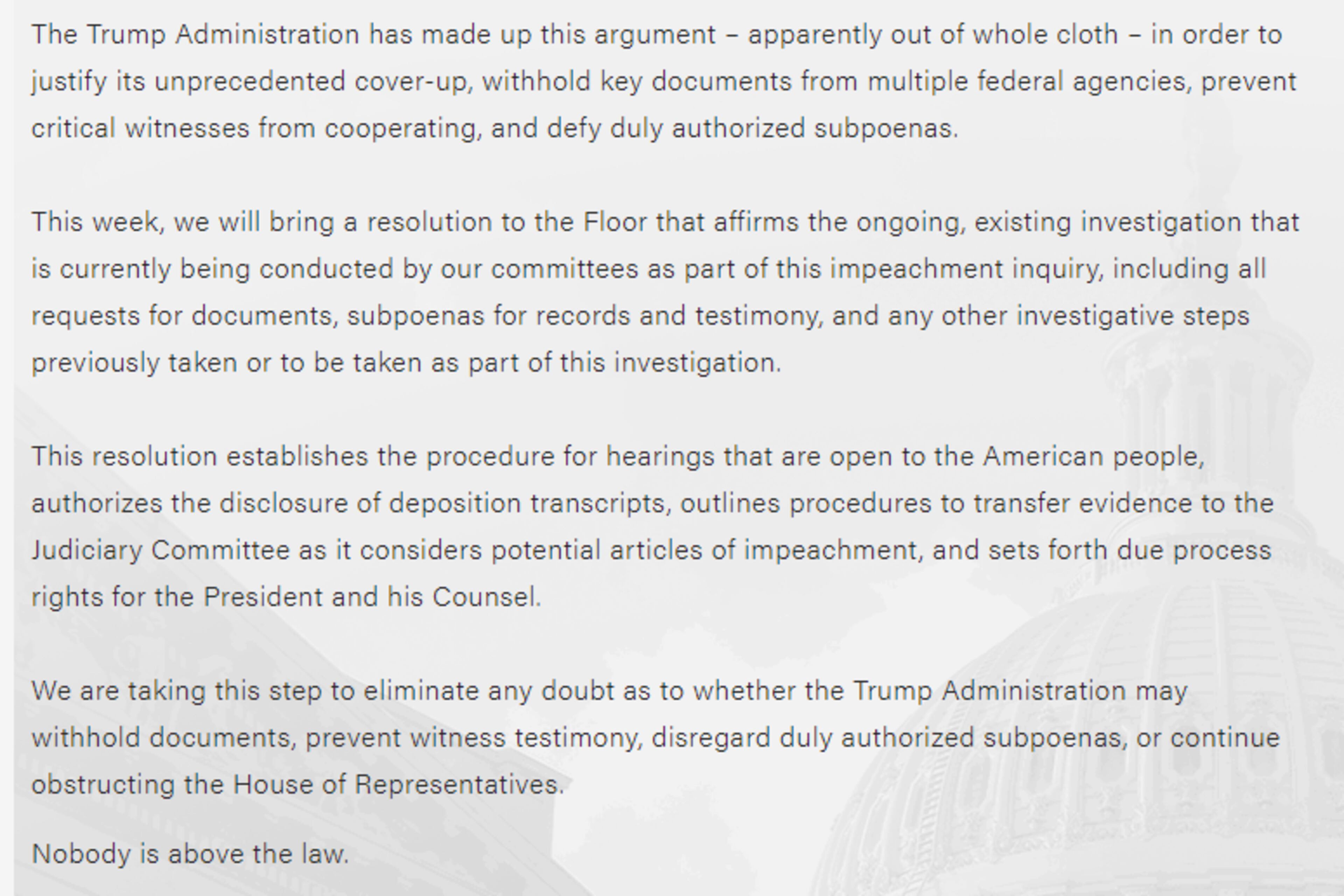 "Of course this argument has no merit," Pelosi added, telling Democrats that a resolution would be brought up for a vote in the House this week to establish the parameters for public hearings, the release of deposition transcripts, and more.
