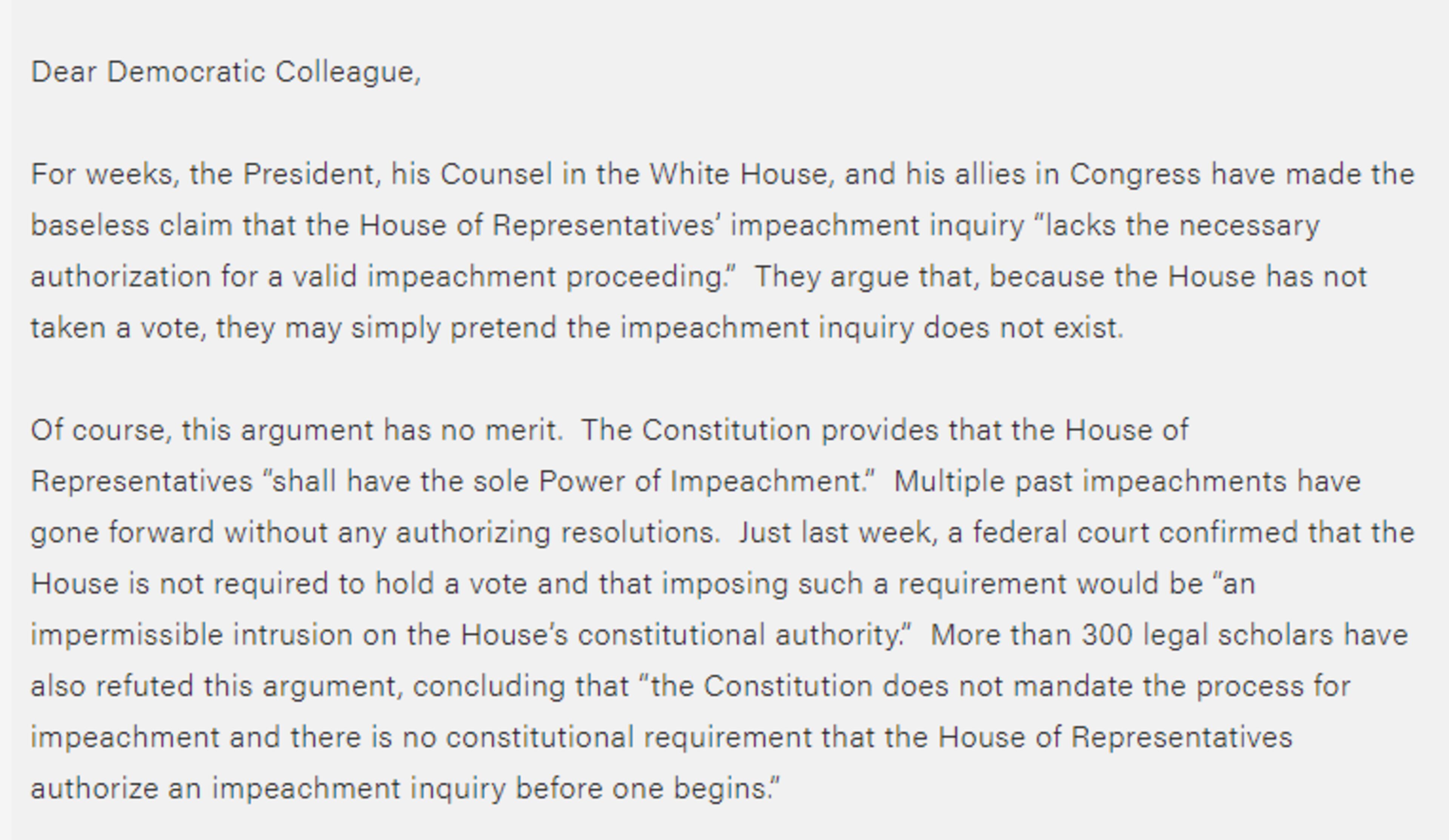 "For weeks, the President, his Counsel in the White House, and his allies in Congress have made the baseless claim that the House of Representatives’ impeachment inquiry 'lacks the necessary authorization for a valid impeachment proceeding,'" Pelosi wrote in a letter to fellow House Democrats.