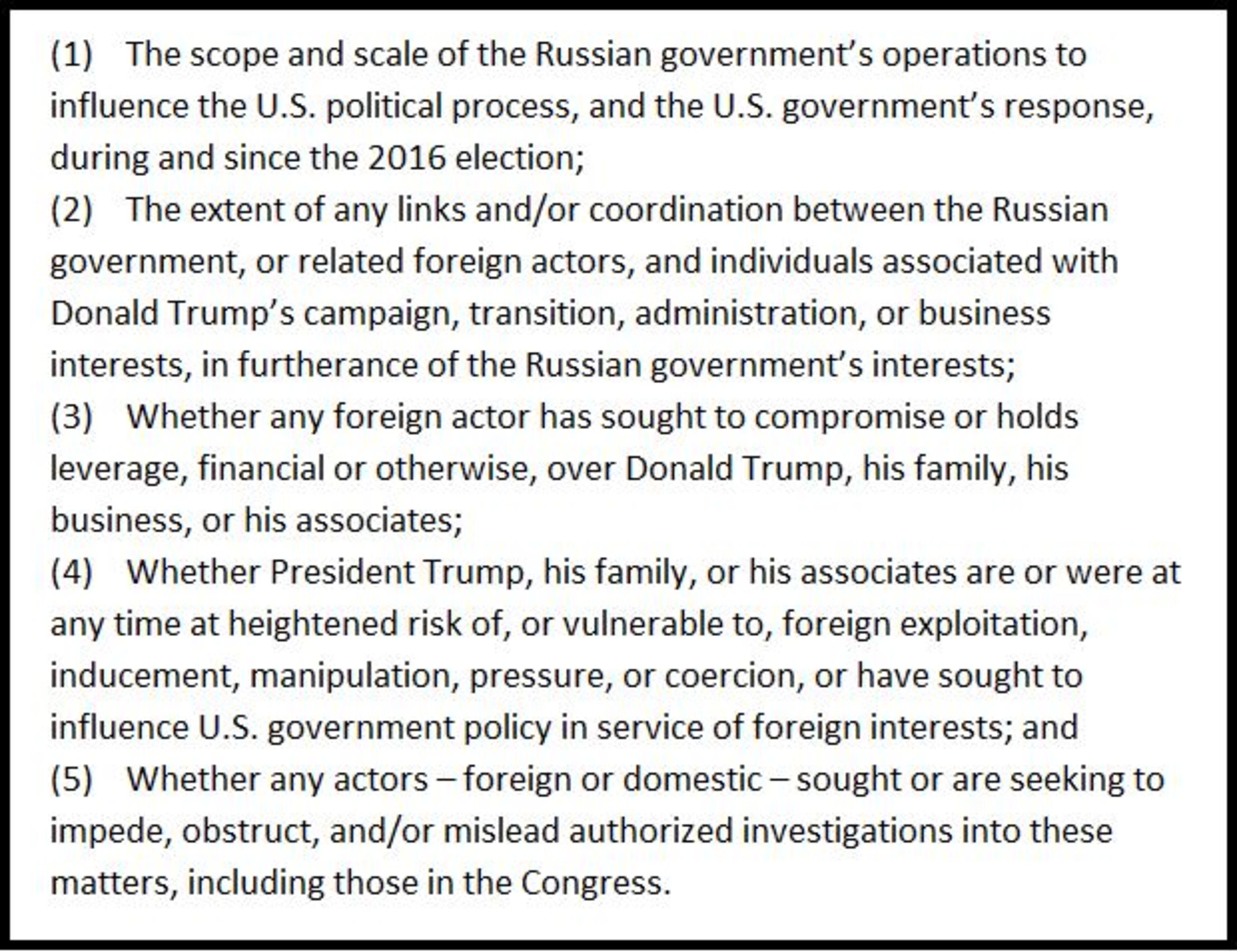 The investigative plan includes a central question of, "Whether any foreign actor has sought to compromise or holds leverage, financial or otherwise, over Donald Trump, his family, his business, or his associates."