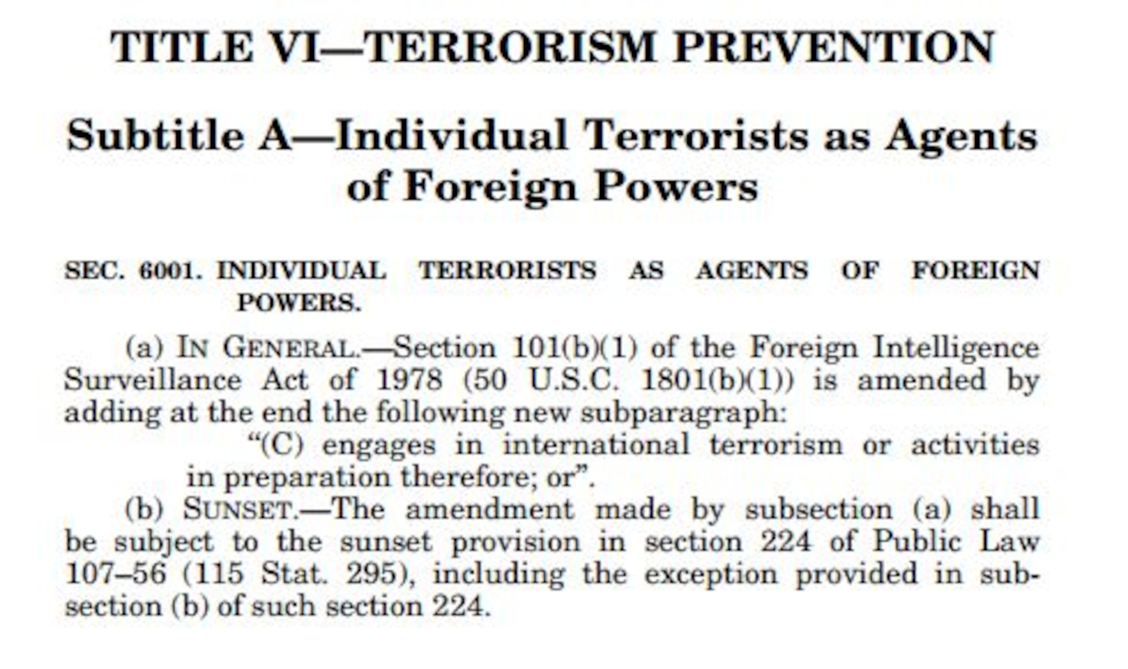 + A provision on surveillance dealing with "lone wolf" terrorists. Contrary to many news reports, this was not part of the original Patriot Act; it was a provision added to an intelligence surveillance law in 2004 (Section 6001 as seen below.)