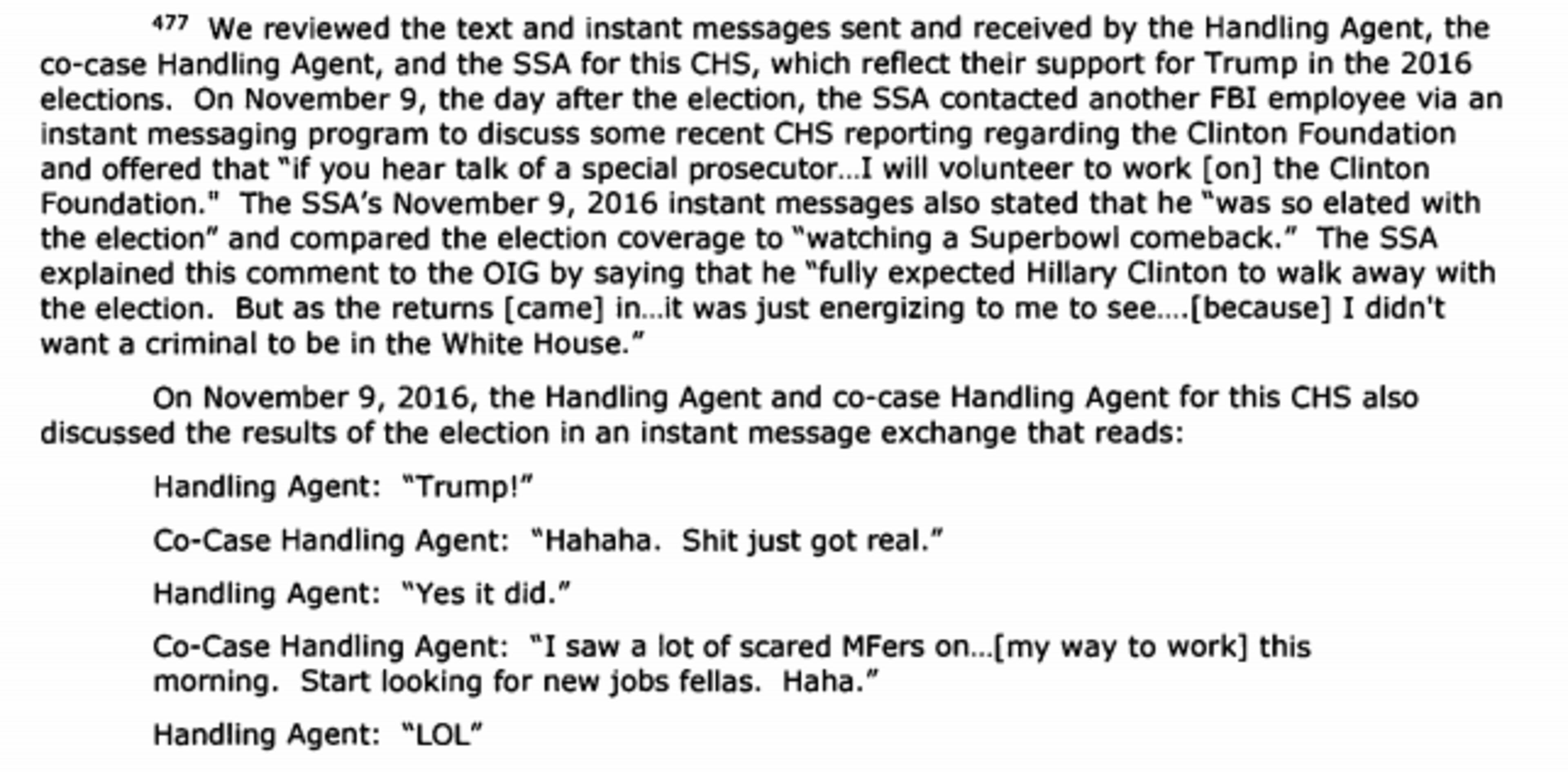 On the other side, the report also found evidence from some FBI investigators that they favored Mr. Trump - also leaving an electronic paper trail - and in this case, indicating their desire to investigate the Clinton Foundation.