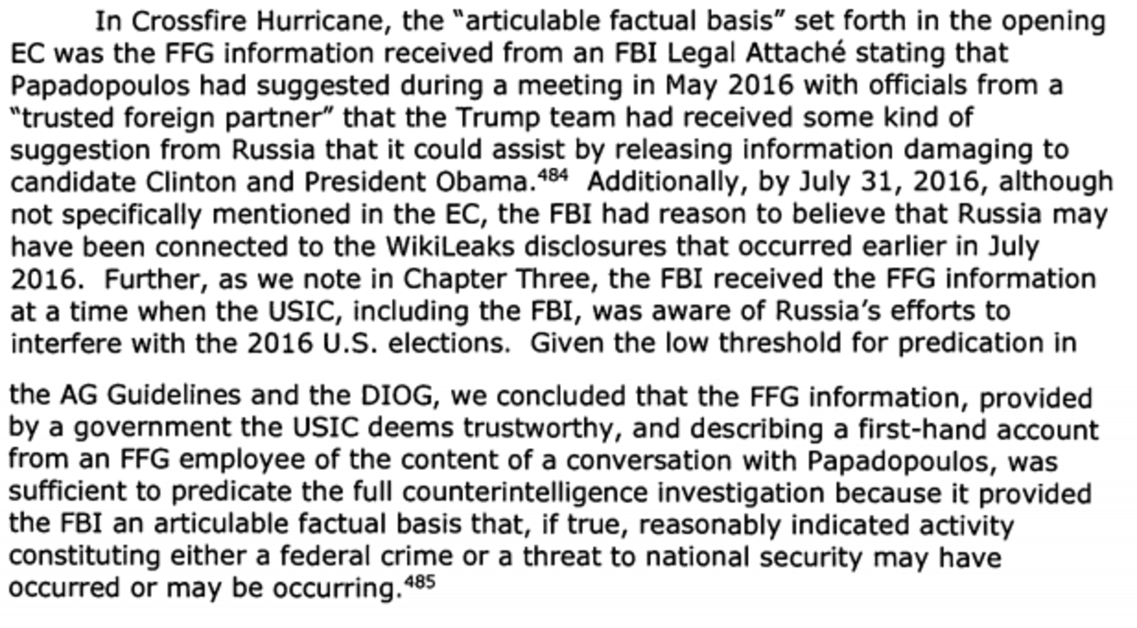 IG Report says that there was an"articulable factual basis reasonably indicating activity may be occurring that may constitute a federal crime or a threat to national security" wrt Page, Flynn, Manafort.