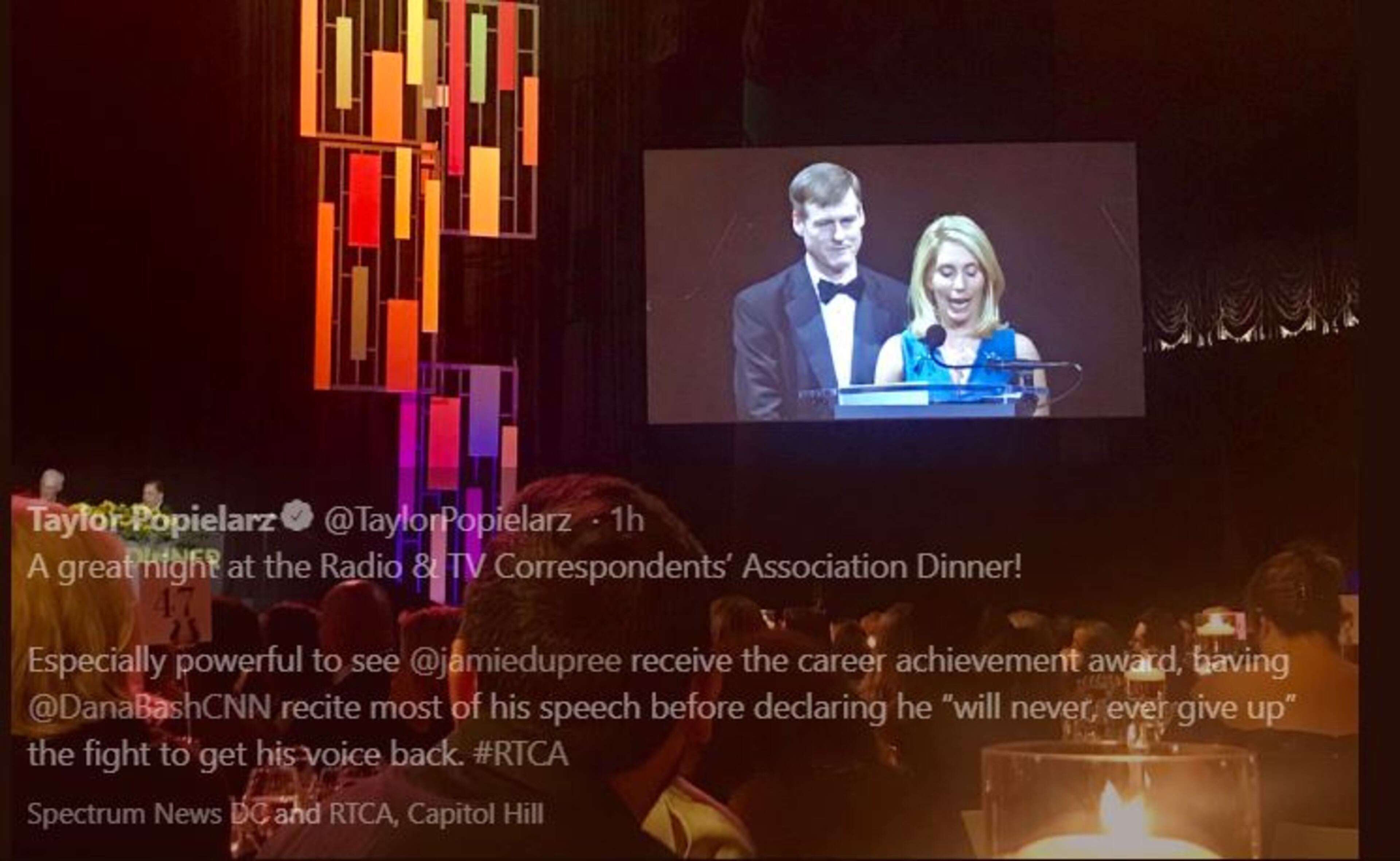 I asked my long time friend and colleague Dana Bash of CNN to join me on stage to read my remarks for me; Dana was a producer for CNN when we first met back during the Monica Lewinsky scandal. Now she is a force on cable news.