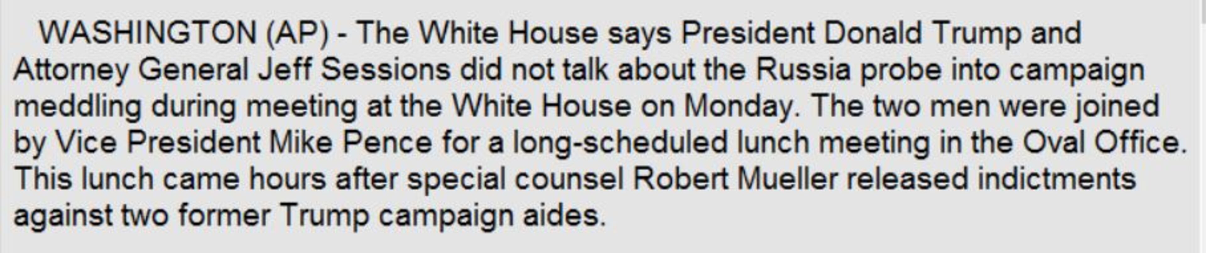 4:45 pm - What was discussed at lunch? The White House says today's indictments, and one guilty plea for misleading investigators, was not on the agenda when President Trump had lunch with Vice President Pence and Attorney General Sessions.