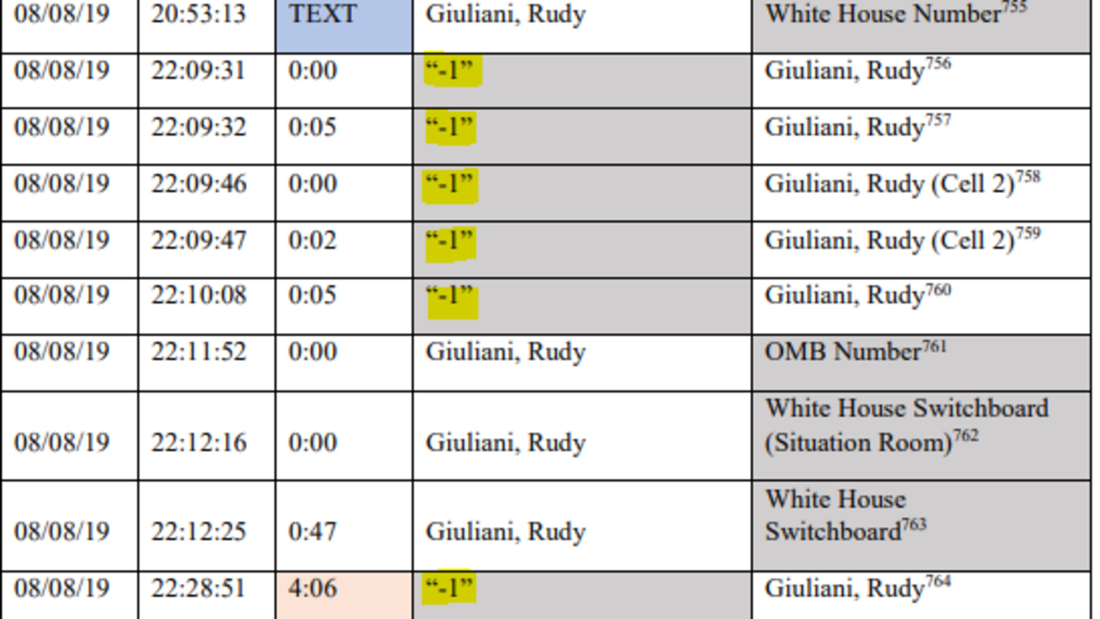 Phone records obtained by the House Intelligence Committee and made public in a new impeachment report from Democrats show President Donald Trump's personal lawyer speaking to the White House and figures in the Ukraine investigation at key times in 2019, and also reveal contacts between Giuliani a mystery phone number labeled only as "-1" in call records.