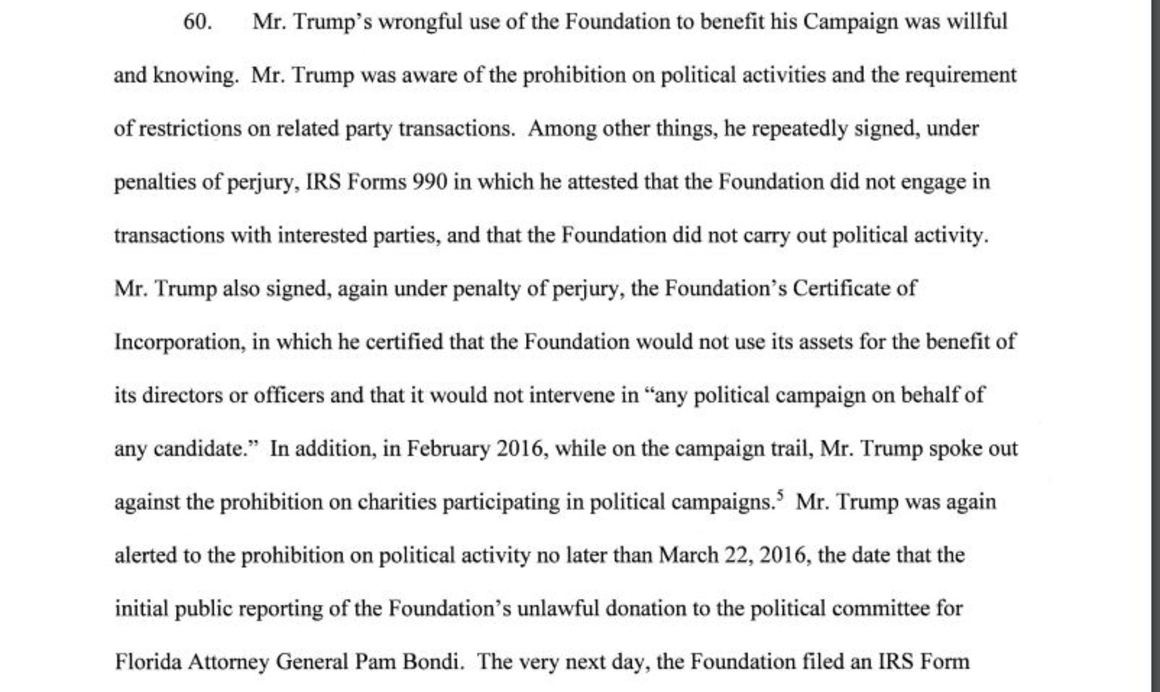 "Mr. Trump's wrongful use of the Foundation to benefit his Campaign was willful and knowing," the lawsuit states.