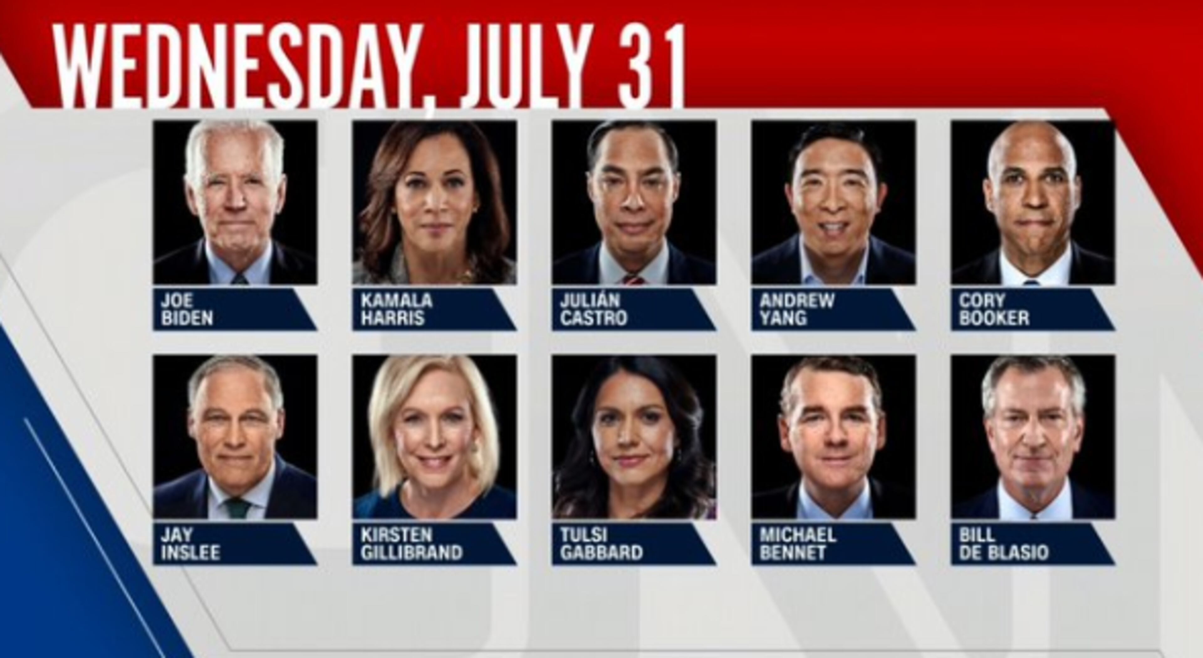+ JOE BIDEN - The former Vice President remains the overall front runner in the Democratic race, though his first debate had some rusty moments in late June, as it was the first time since 2008 that Biden had been up on a debate stage with other Democrats. On either side of him will be Kamala Harris - who tangled with Biden in the first debate over race issues - and Cory Booker, who has made clear he's going to go after Biden as well. We'll see how well the Delaware Democrat has prepped for this second round.
