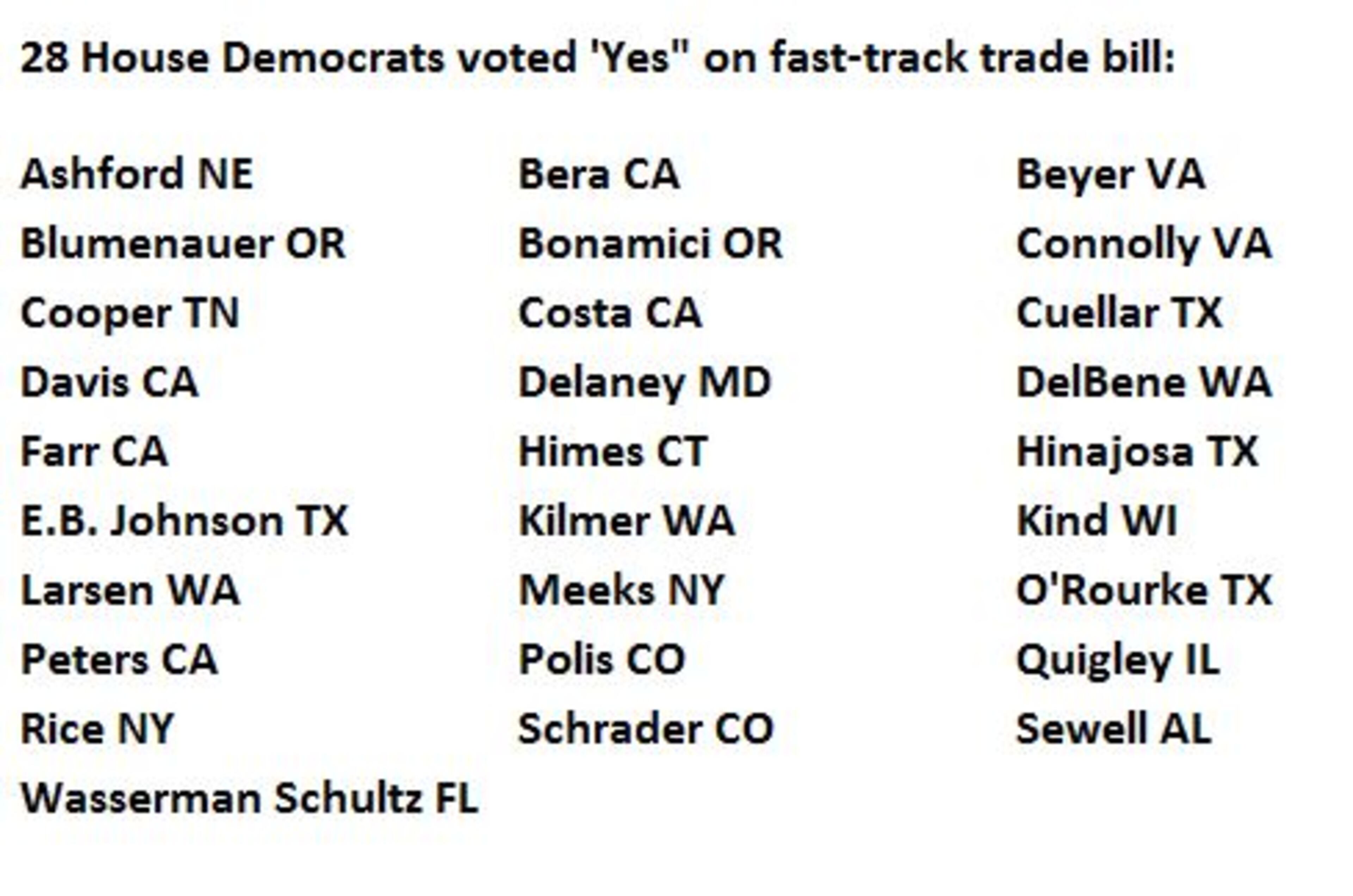 While most Democrats were opposed to the plan, there were 28 who broke with their leadership and voted with President Obama on trade: