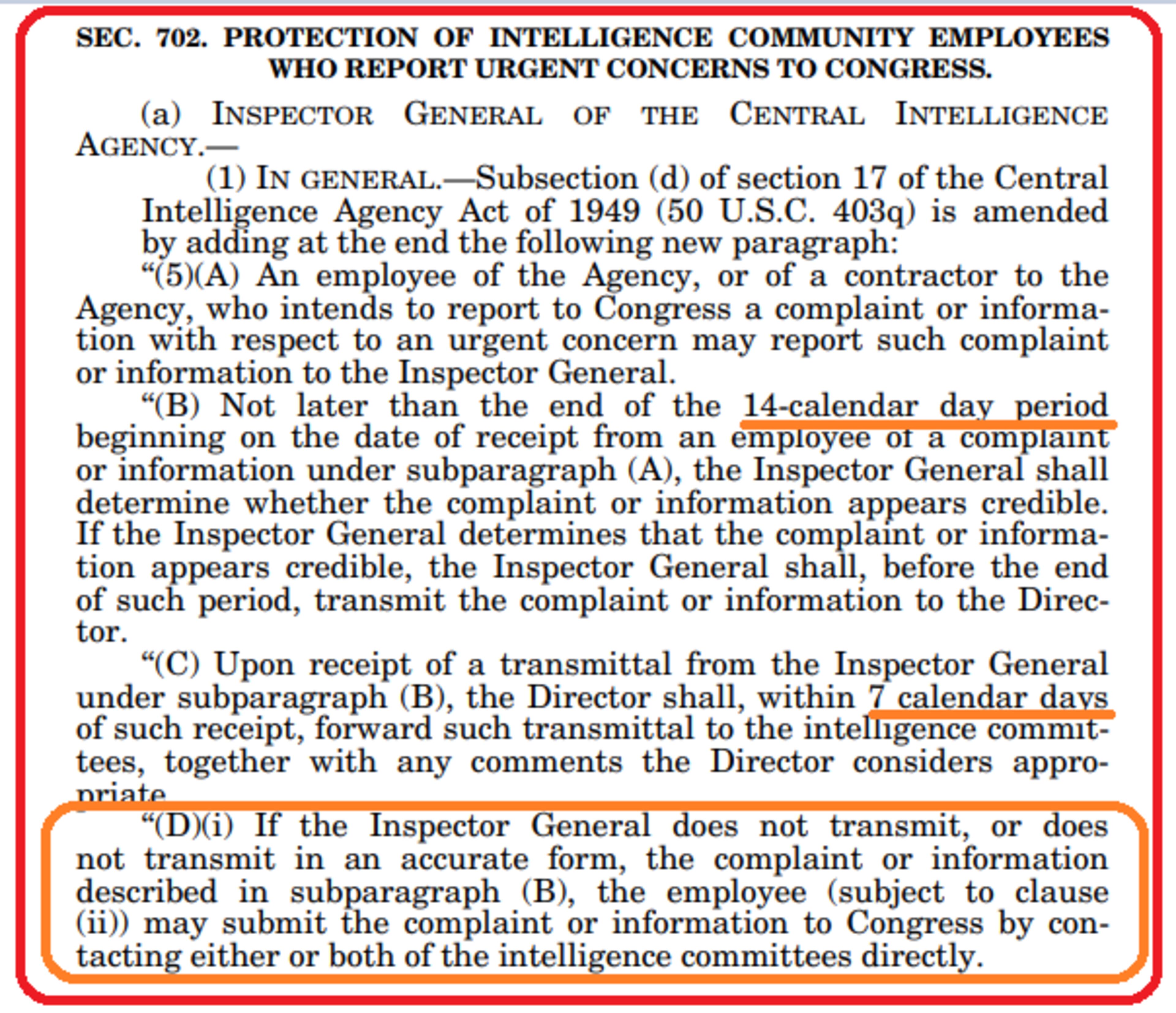 At issue is what's known as the 'Intelligence Community Whistleblower Protection Act,' which says if an internal complaint is judged to be urgent by the Inspector General of the Intelligence Community - then it is sent to the Congressional intelligence committees.