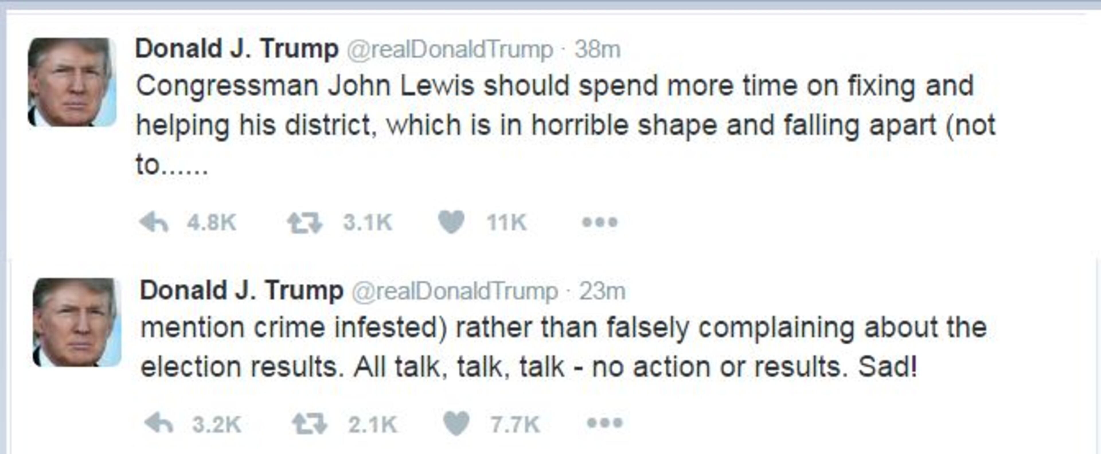 Hours after Rep. John Lewis (D-GA) announced that he would boycott the January 20 swearing-in of President-Elect Donald Trump, Mr. Trump took to Twitter to denounce the veteran Democratic lawmaker and civil rights leader, telling him to deal with his "crime infested" district in Atlanta.