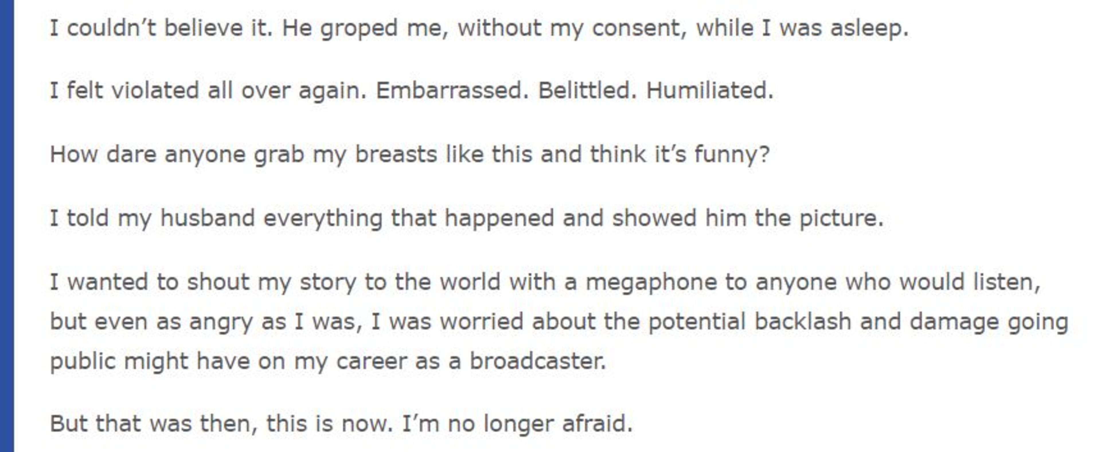 "All I could think about was getting to a bathroom as fast as possible to rinse the taste of him out of my mouth," saying she "felt disgusted and violated" by what had happened backstage.