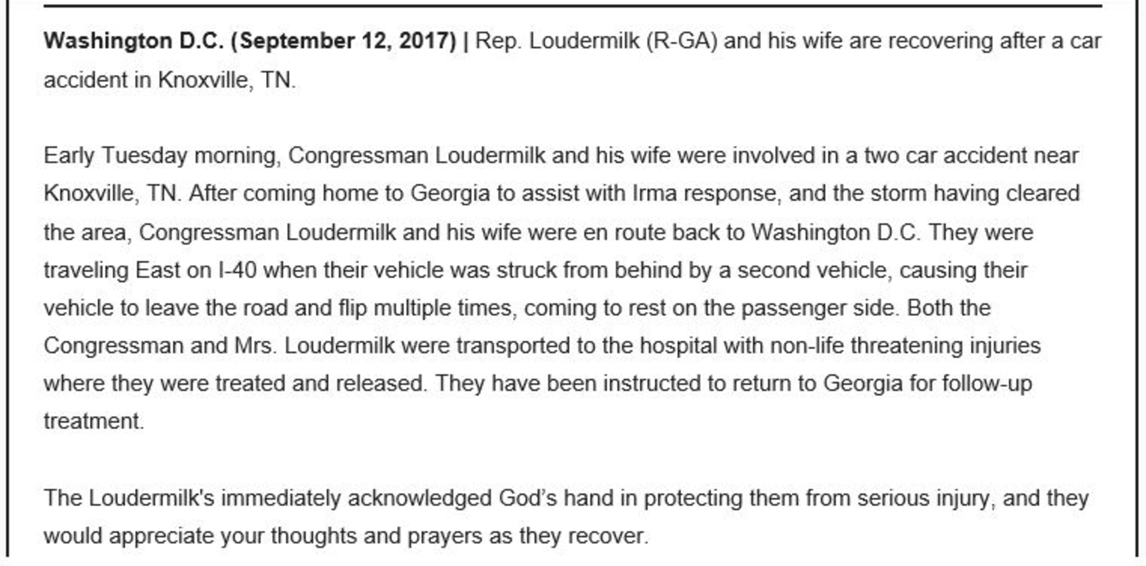The force of the impact caused the Loudermilks' car "to leave the road and flip multiple times, coming to rest on the passenger side. Both the Congressman and Mrs. Loudermilk were transported to the hospital with non-life threatening injuries where they were treated and released."