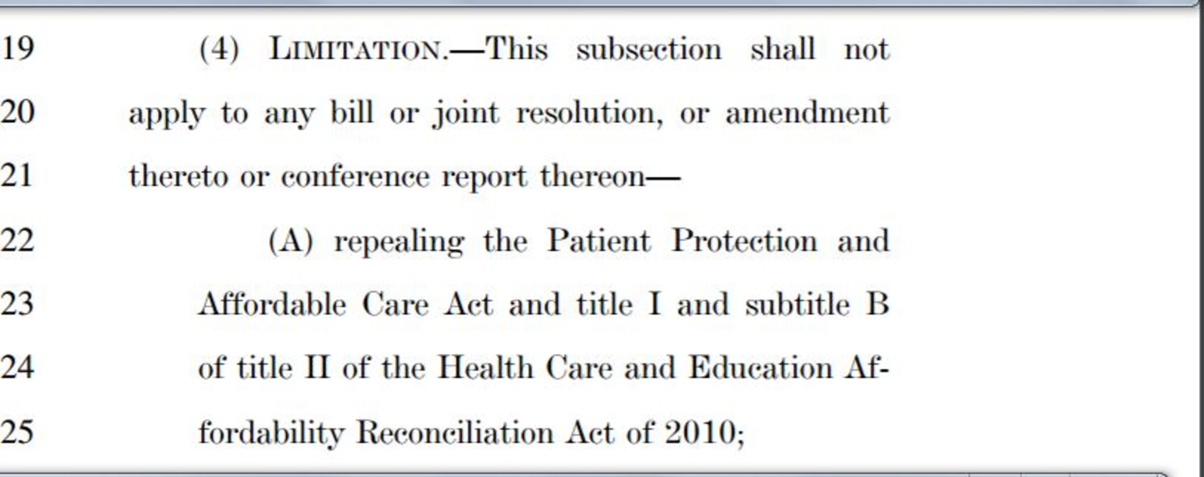 "This subsection shall not apply," the resolution states, to any effort to repeal the Affordable Care Act - the official name of the Obama health law, or part of the Health Care and Education Affordability Reconciliation Act of 2010, which held some parts of those same reforms.