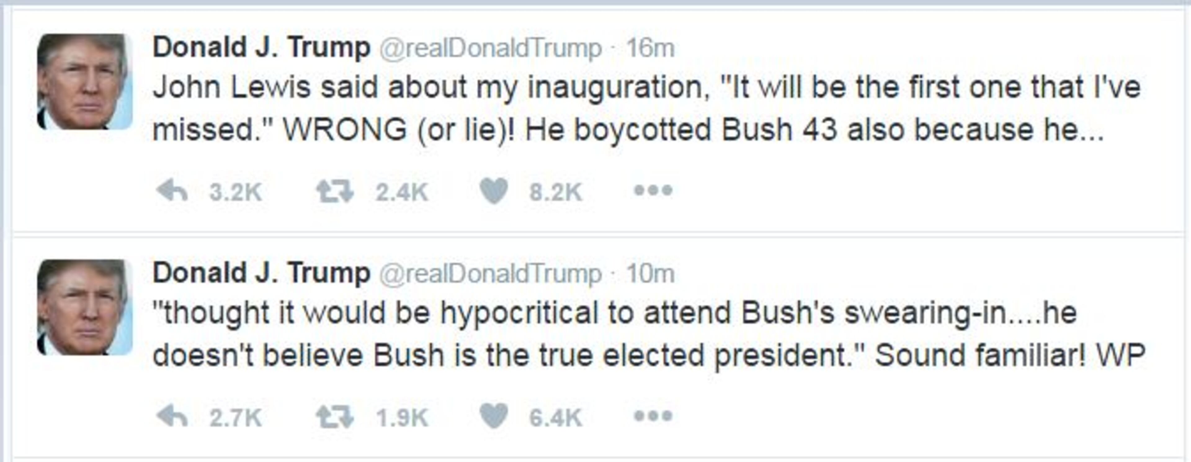 The President-Elect wasn't dropping the issue either, as on Tuesday he used both Twitter and an interview with Fox News to jab at Rep. John Lewis (D-GA), who last week said he would boycott his first inaugural because of Trump.