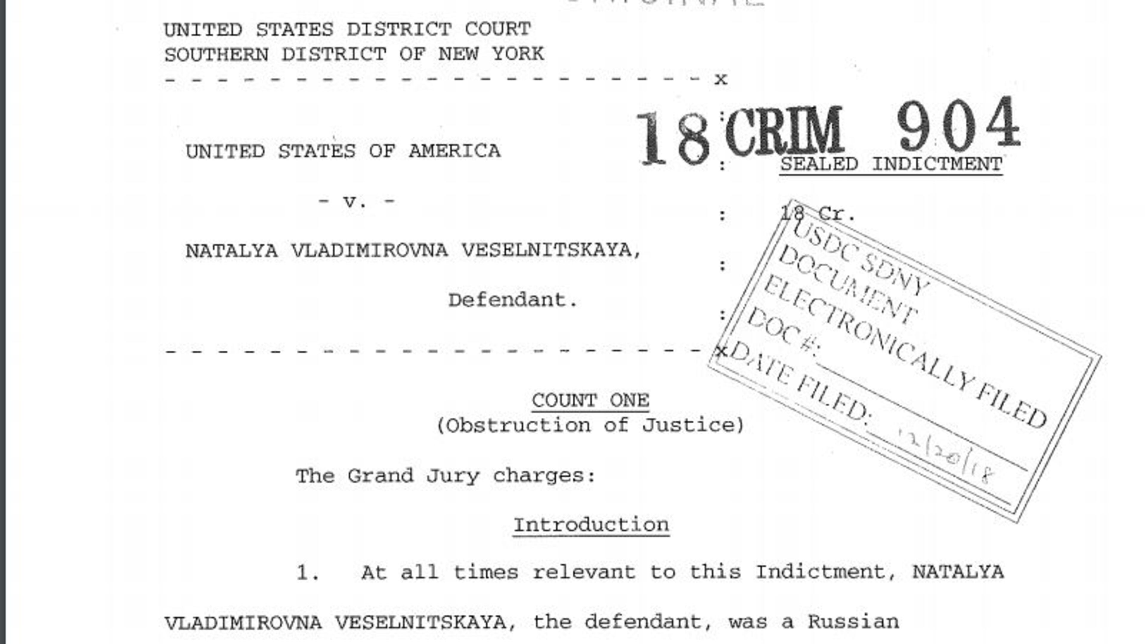 Court records show the indictment was submitted to a federal judge and sealed on December 20, 2018; it involves a fraud investigation that sought to recover property in the United States - mainly New York real estate - as the feds allege that was part of the Russian tax fraud scheme that Veselnitskaya tried to protect.