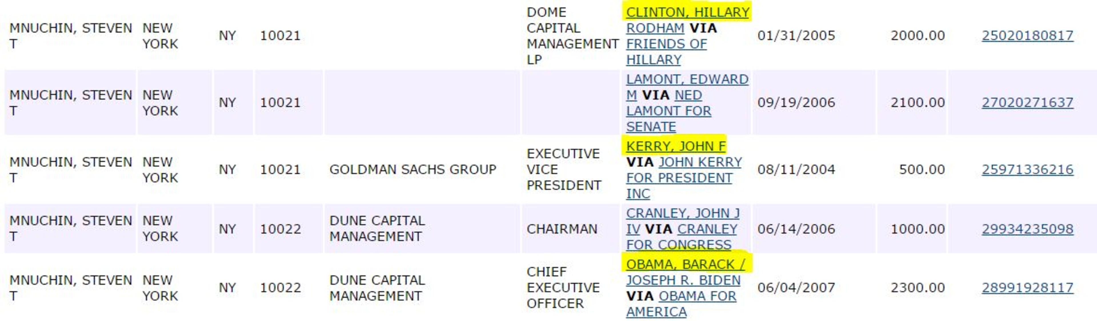 In this screenshot from the Federal Election Commission website, you can see that Mnuchin gave money to Hillary Clinton, John Kerry, and Barack Obama.