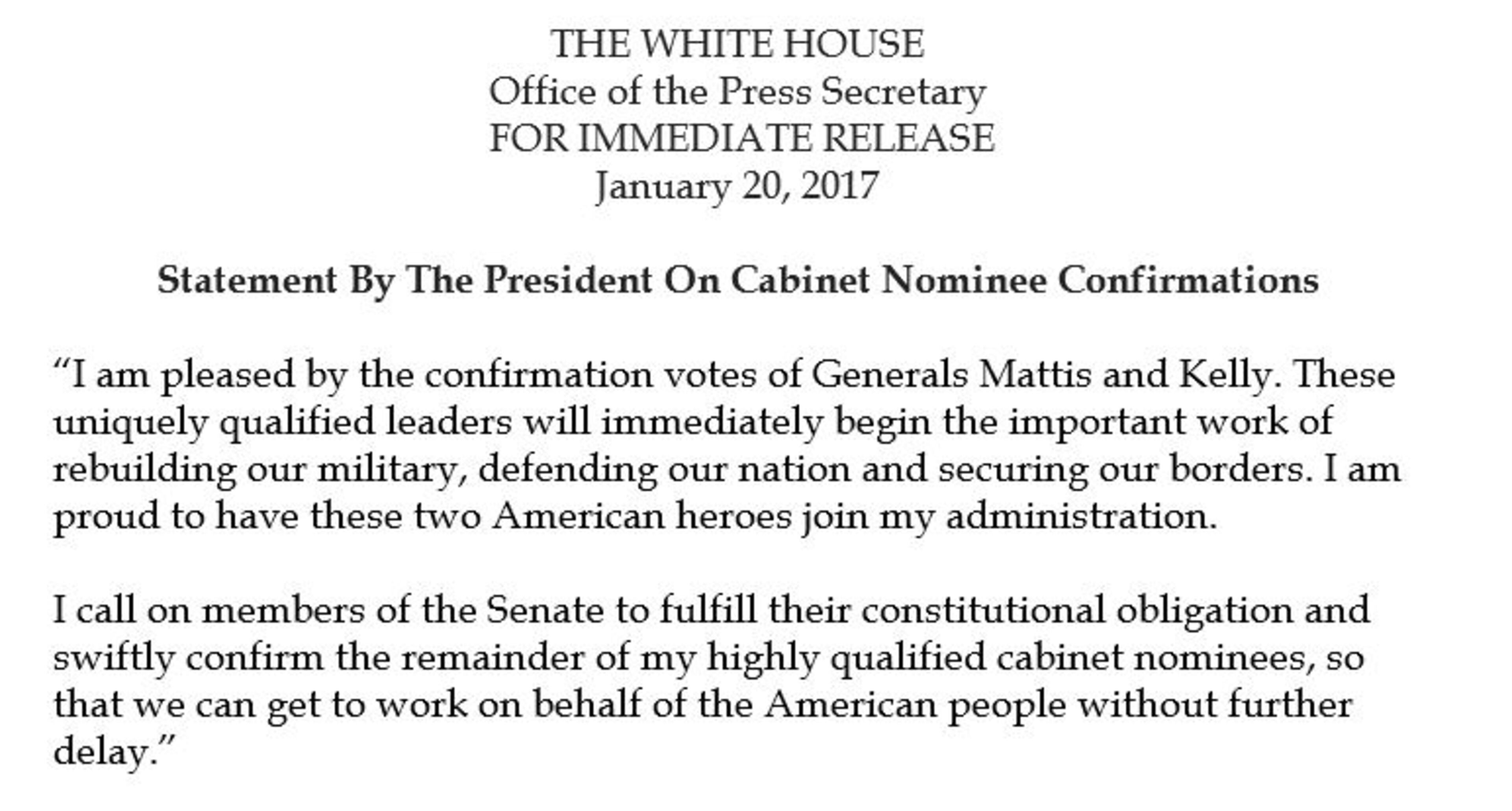 “I am pleased by the confirmation votes of Generals Mattis and Kelly," the President said in his first written statement issued by the White House.