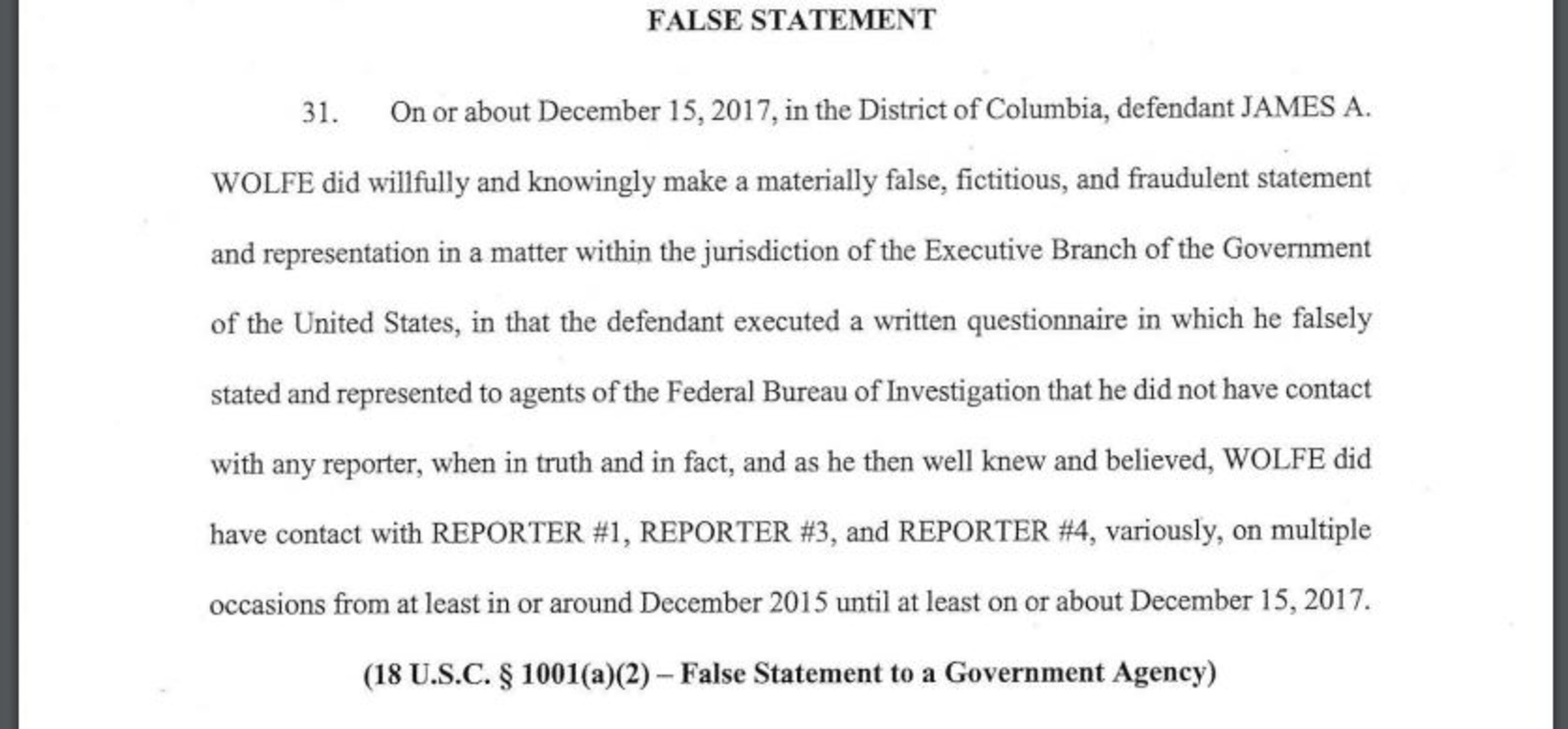 In the indictment unsealed last week, Wolfe was told in late October of 2017 that FBI agents were investigating leaks of classified information; in December, Wolfe was asked about certain news reports, and whether he had contact with several unnamed reporters.